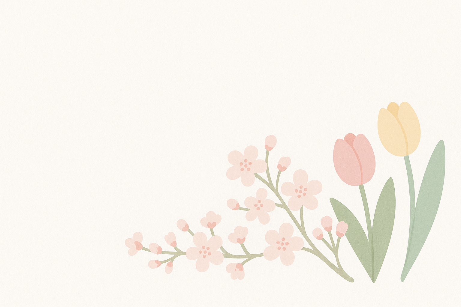Illustration minimaliste avec des tulipes jaunes et roses et des fleurs de cerisier stylisées en rose pâle, sur fond crème texturé. Couleurs pastel douces, composition florale en bas à droite, style épuré et professionnel. Idéal pour ambiance printanière, naturelle et élégante.