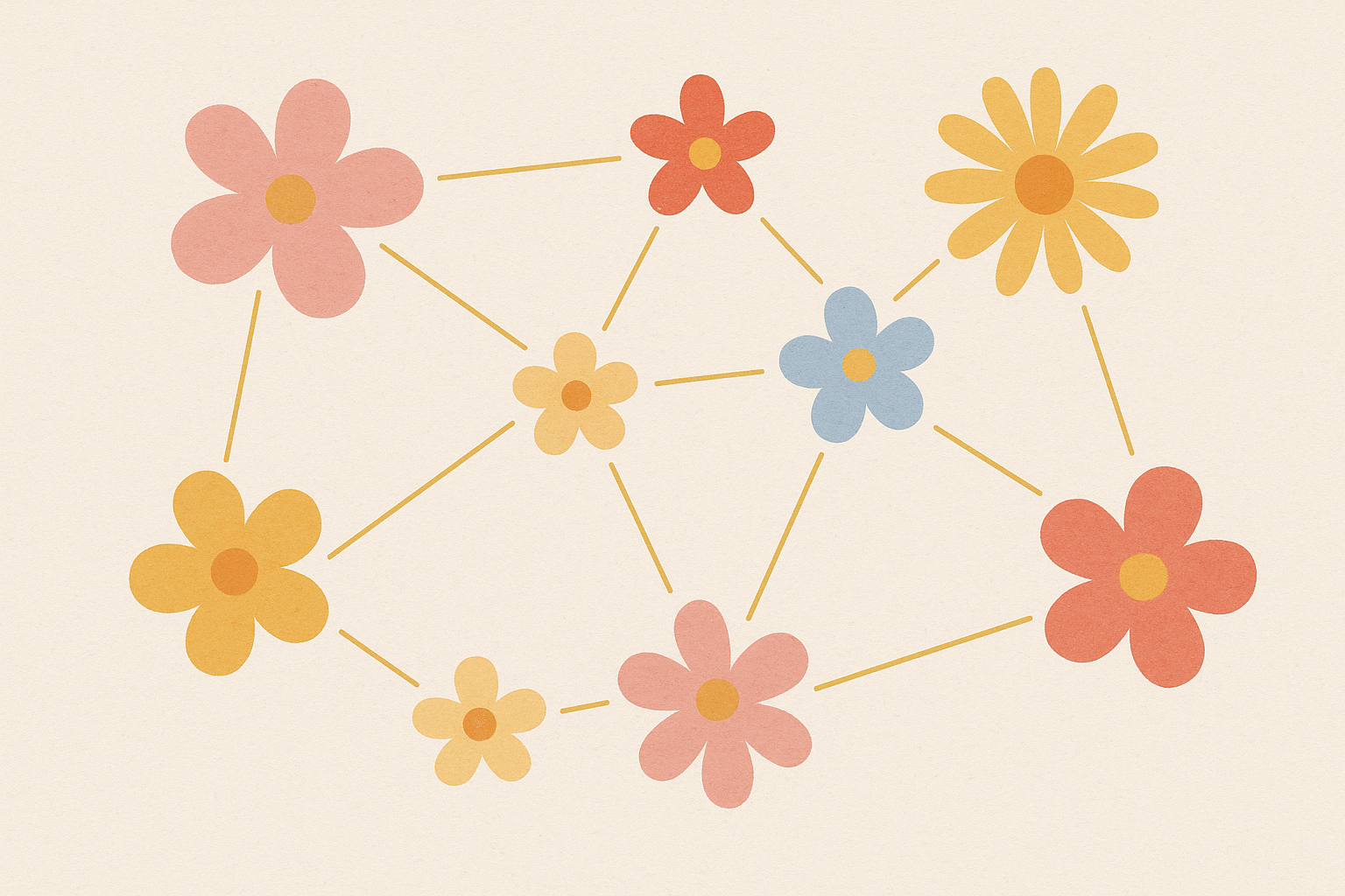 Illustration minimaliste avec des fleurs stylisées en rose, bleu, orange et jaune pastel, reliées par des lignes géométriques fines jaunes sur fond crème texturé. Le design présente une disposition linéaire et équilibrée des éléments floraux, évoquant un style doux, moderne et professionnel. Idéal pour des visuels de papeterie, cartes postales d'affaires ou communication élégante.