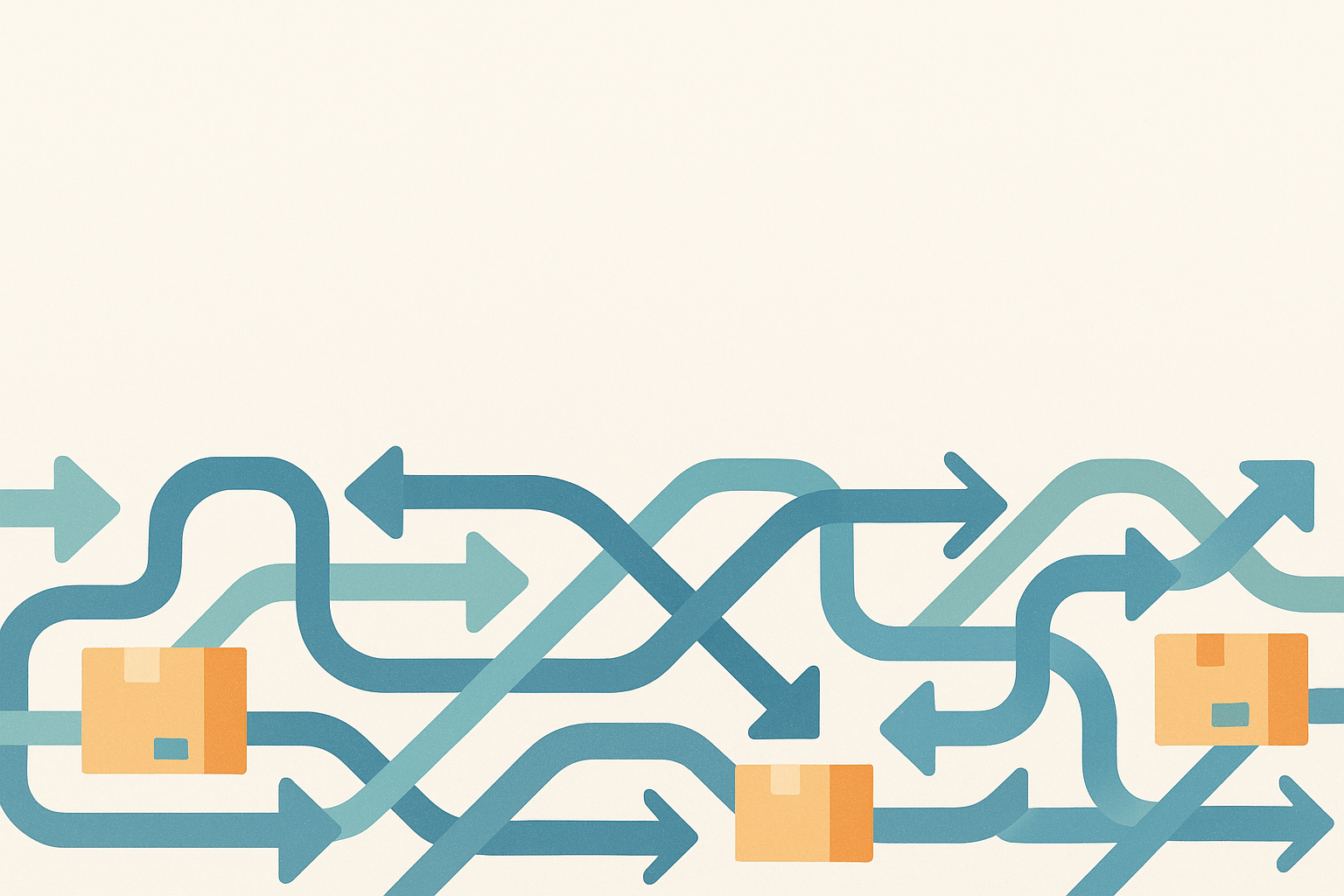 Illustration vectorielle stylisée avec des flèches entrelacées bleu clair, bleu foncé et turquoise représentant des flux directionnels, accompagnées de colis orange et jaune. Fond beige uni, style épuré et géométrique, parfait pour des thèmes de logistique, transport, réseau ou organisation. Design professionnel et abstrait, adapté à une communication B2B visuelle.