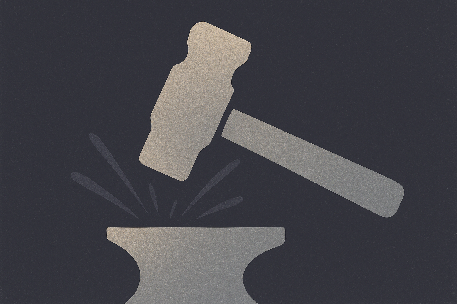 Illustration minimaliste aux tons pastel beige, ocre, vert sauge et gris doux représentant un marteau, une enclume, un fer à cheval, des feuilles stylisées, des clous, des spirales et des étoiles. Composition équilibrée en bas de l’image, laissant un grand espace vide en haut pour le texte. Style épuré, artisanal et chaleureux, parfait pour des visuels de communication professionnelle ou artisanale.