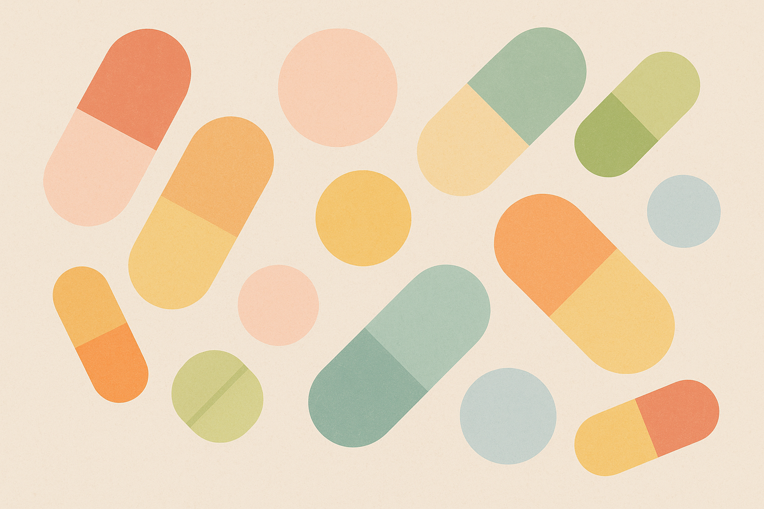 Design minimaliste avec des formes géométriques arrondies (capsules, cercles) en dégradés pastel : orange, rose, jaune, vert menthe, bleu ciel. Fond crème texturé, ambiance douce et professionnelle. Composition équilibrée en bas de l’image laissant un grand espace vide pour le texte ou le message.
