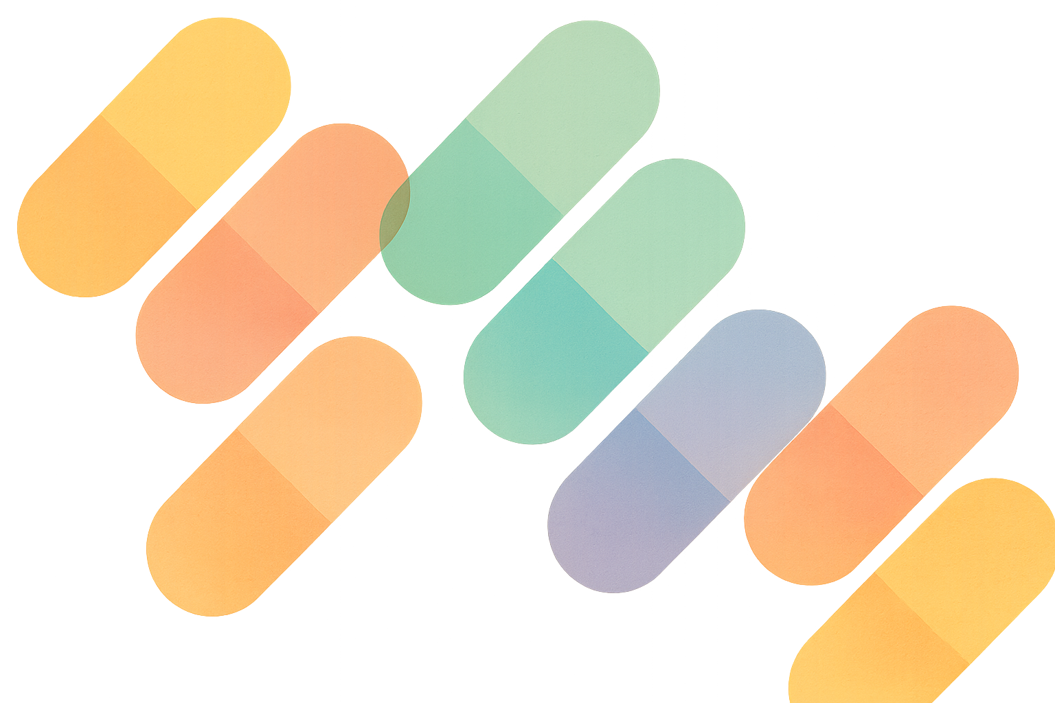 Fond dégradé doré avec des formes géométriques superposées en capsules ovales aux couleurs pastel (rose, jaune, bleu, vert, orange). Les éléments sont semi-transparents, avec des effets de superposition et d’ombres douces. Style abstrait, lumineux, épuré et contemporain, parfait pour un usage professionnel ou commercial.