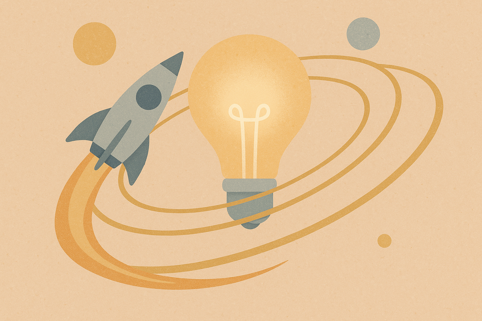 Illustration minimaliste en tons pastel beige et bleu-gris, représentant une ampoule lumineuse entourée d'anneaux orbitaux, une fusée stylisée en vol, des étoiles dorées et des planètes. Le style est doux, vectoriel, avec un effet texturé subtil sur fond blanc cassé. Idéal pour des thèmes d'innovation, de technologie ou de lancement de projet.