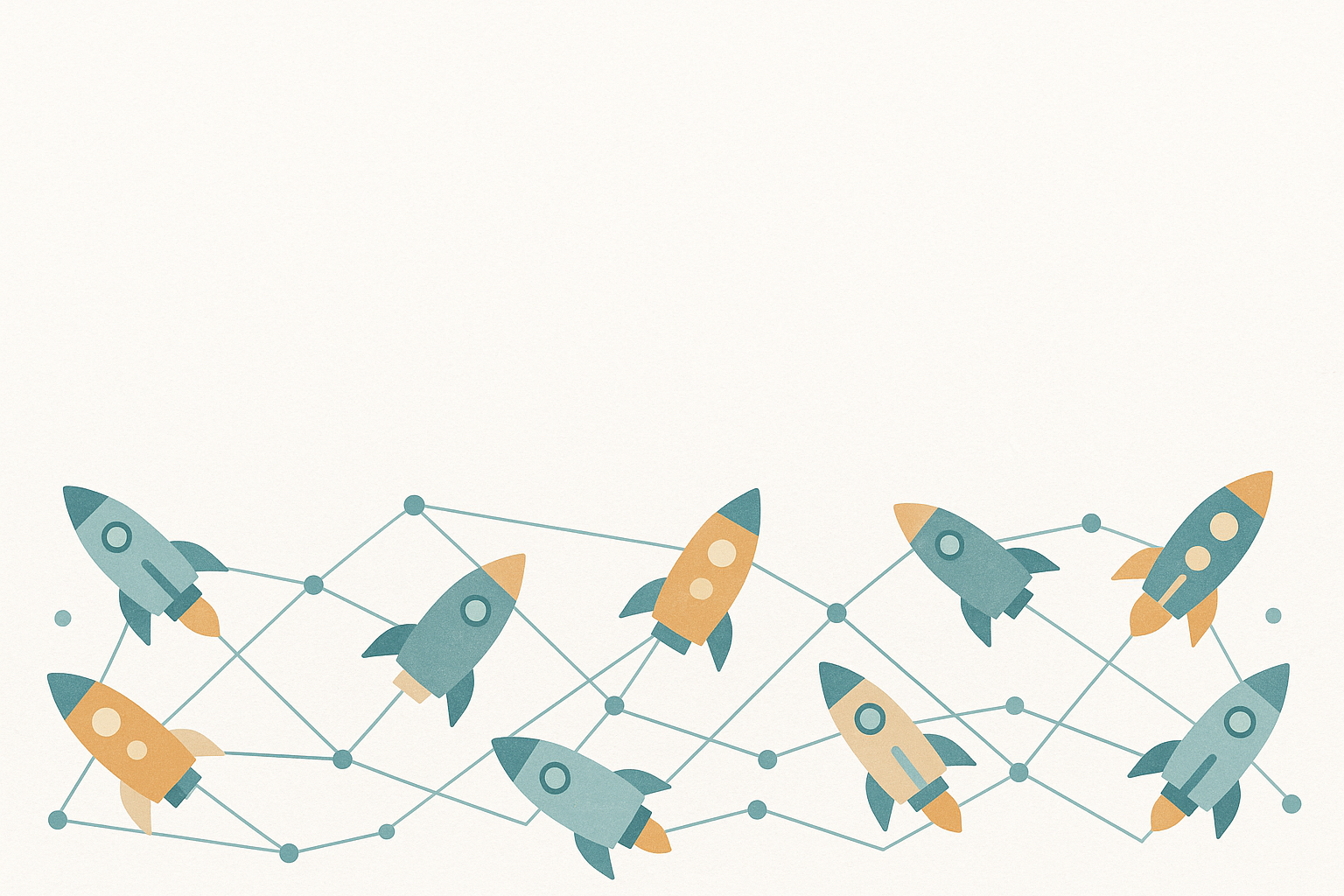 Illustration vectorielle de fusées stylisées en bleu, turquoise et orange pastel, disposées en bas de l'image sur un fond crème. Les fusées sont reliées entre elles par un réseau de lignes et de points géométriques, formant un motif évoquant la connectivité et la technologie. Style plat, minimaliste et moderne, avec une grande zone blanche en haut pour l'ajout de texte ou de message.