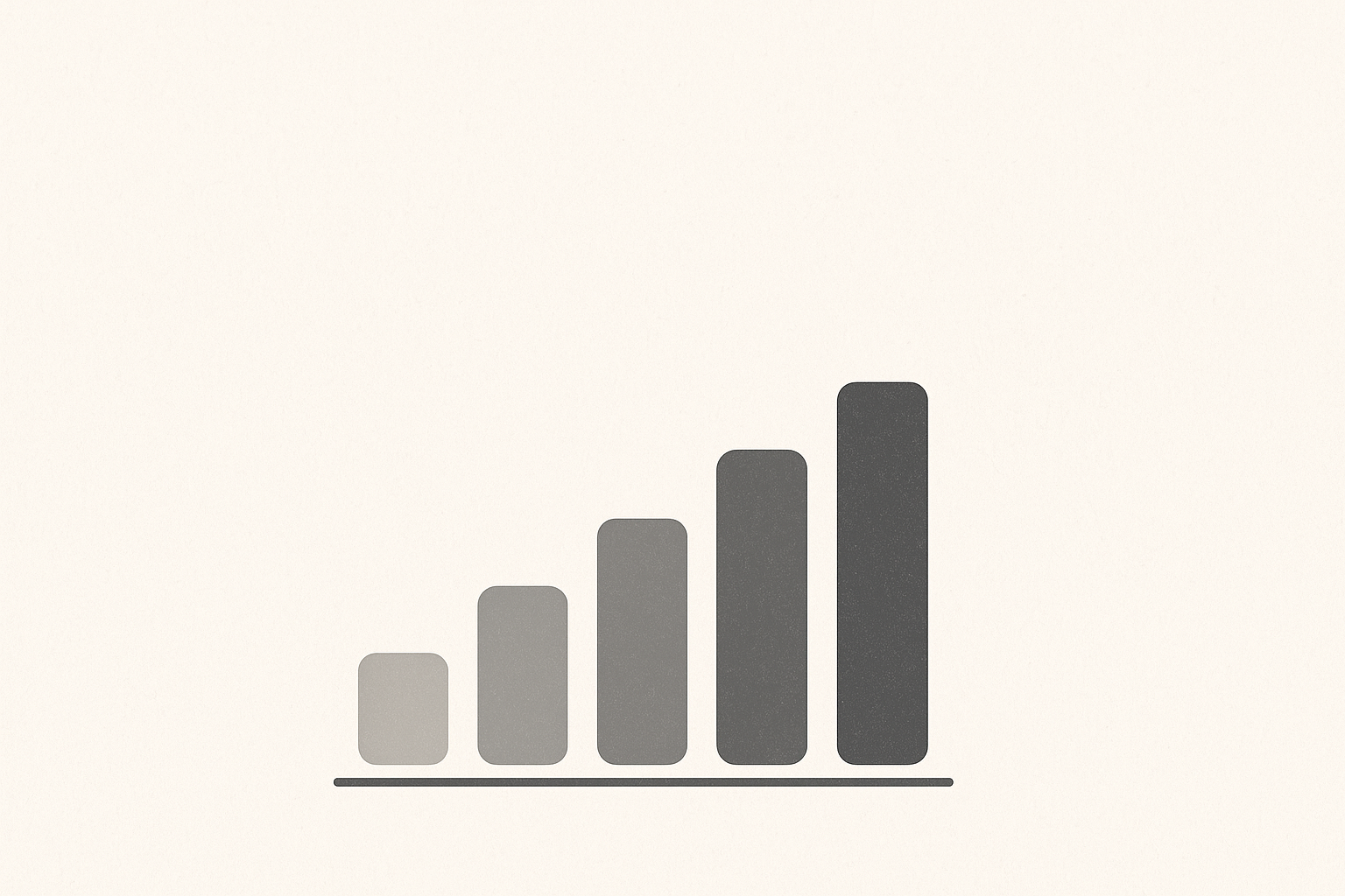 Illustration minimaliste de graphique en barres à cinq colonnes verticales de différentes hauteurs, en dégradé de gris sur fond beige clair. Les barres sont arrondies et alignées sur une ligne horizontale fine, évoquant la croissance, la performance ou l'évolution. Style épuré, professionnel et neutre, parfait pour des visuels d'entreprise ou de communication institutionnelle.