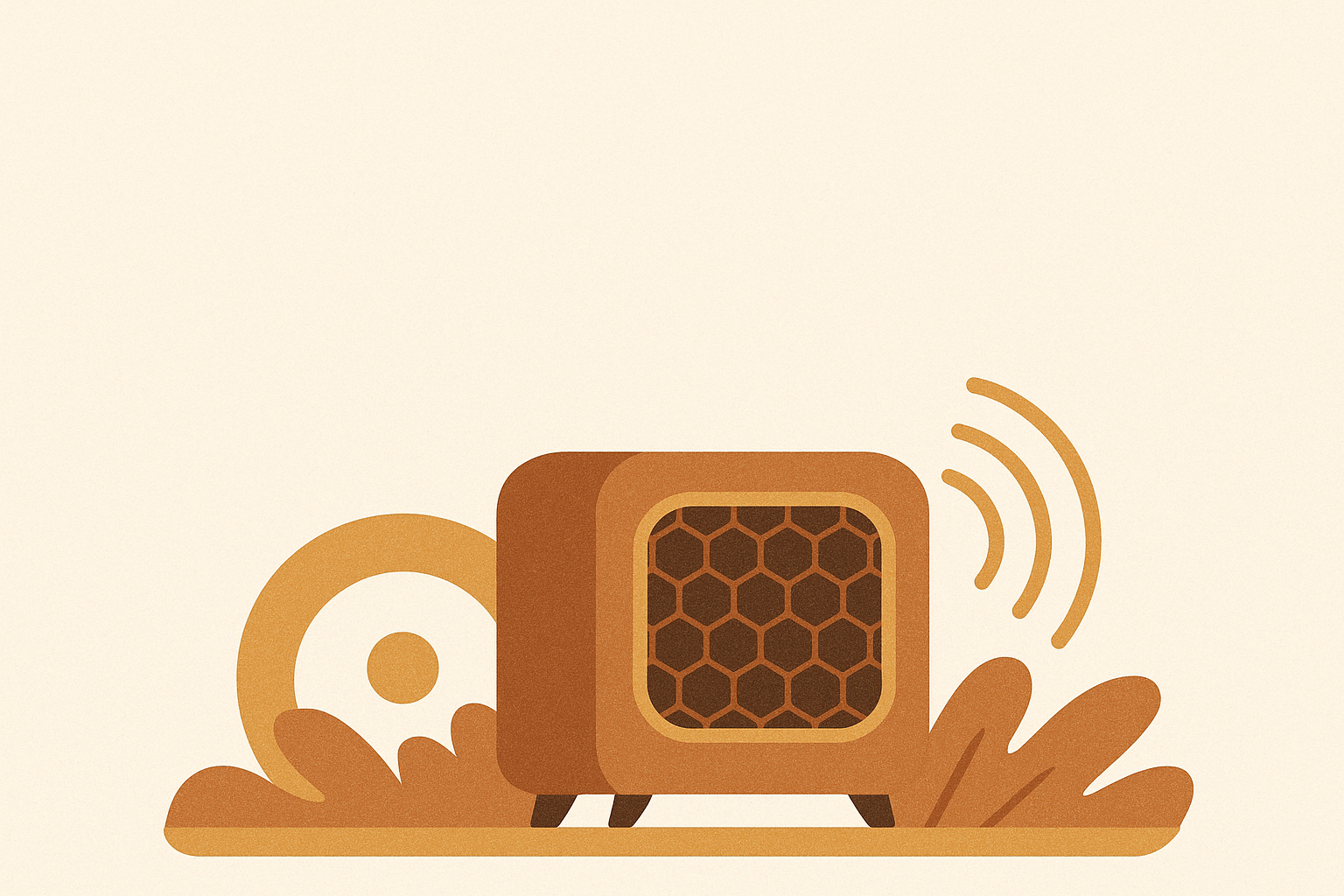 Illustration vectorielle d’un haut-parleur rétro brun avec grille en nid d’abeille, entouré de formes abstraites en beige, ocre et caramel. Le fond est uni, crème clair, avec des ondes sonores stylisées à droite. Style plat, palette de couleurs chaudes et terreuses, ambiance vintage moderne adaptée à la communication visuelle professionnelle.