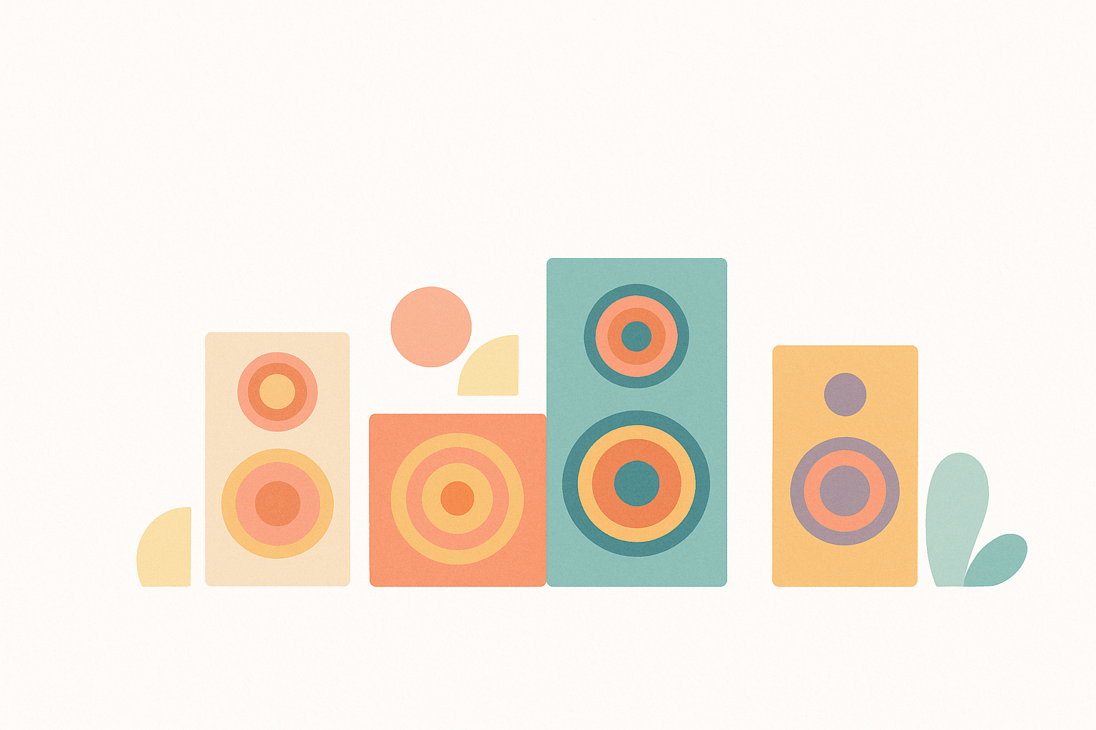 Illustration graphique de haut-parleurs stylisés en formes géométriques simples avec des cercles concentriques et des rectangles. Palette de couleurs pastel comprenant des tons de turquoise, orange, beige, jaune, corail et violet doux. Style minimaliste et abstrait avec une disposition équilibrée sur fond blanc cassé, évoquant une ambiance moderne, créative et professionnelle.