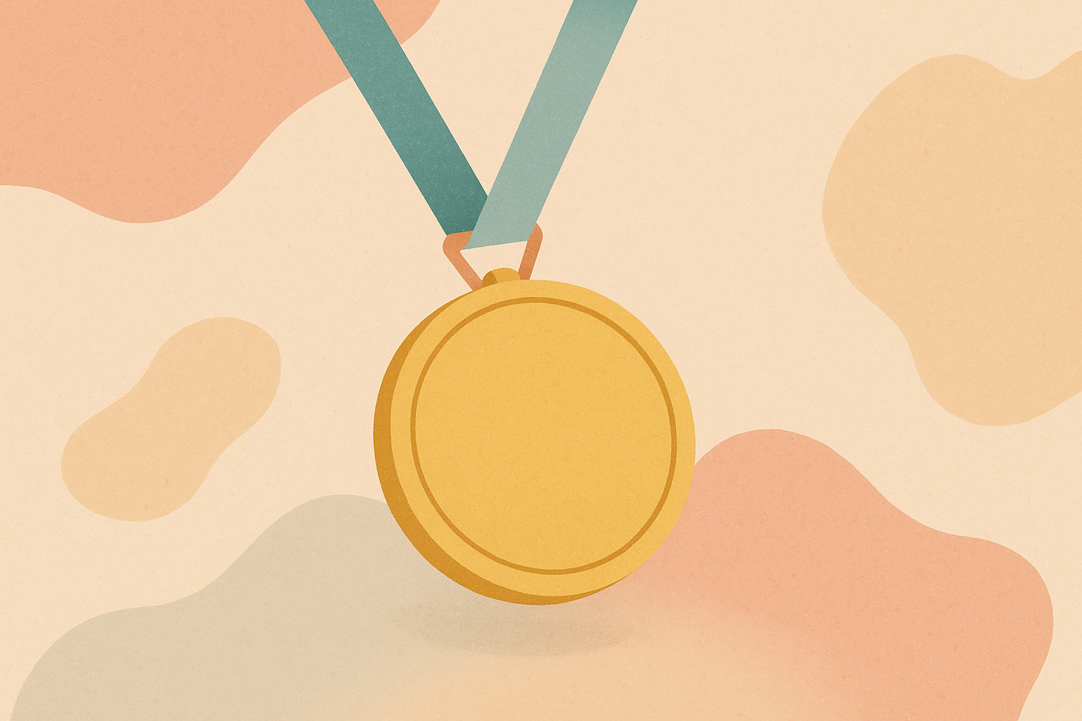 Illustration vectorielle douce avec des couleurs pastel (beige, bleu-gris, orange doux, corail) représentant des icônes académiques : livre ouvert, colonne grecque, médaille dorée, buste, lettre A, étoiles, feuilles et cœurs. Fond crème épuré avec éléments décoratifs dispersés en bas et une médaille suspendue en haut à droite. Style minimaliste, ludique et professionnel, parfait pour des visuels liés à l’éducation, la culture ou la reconnaissance.