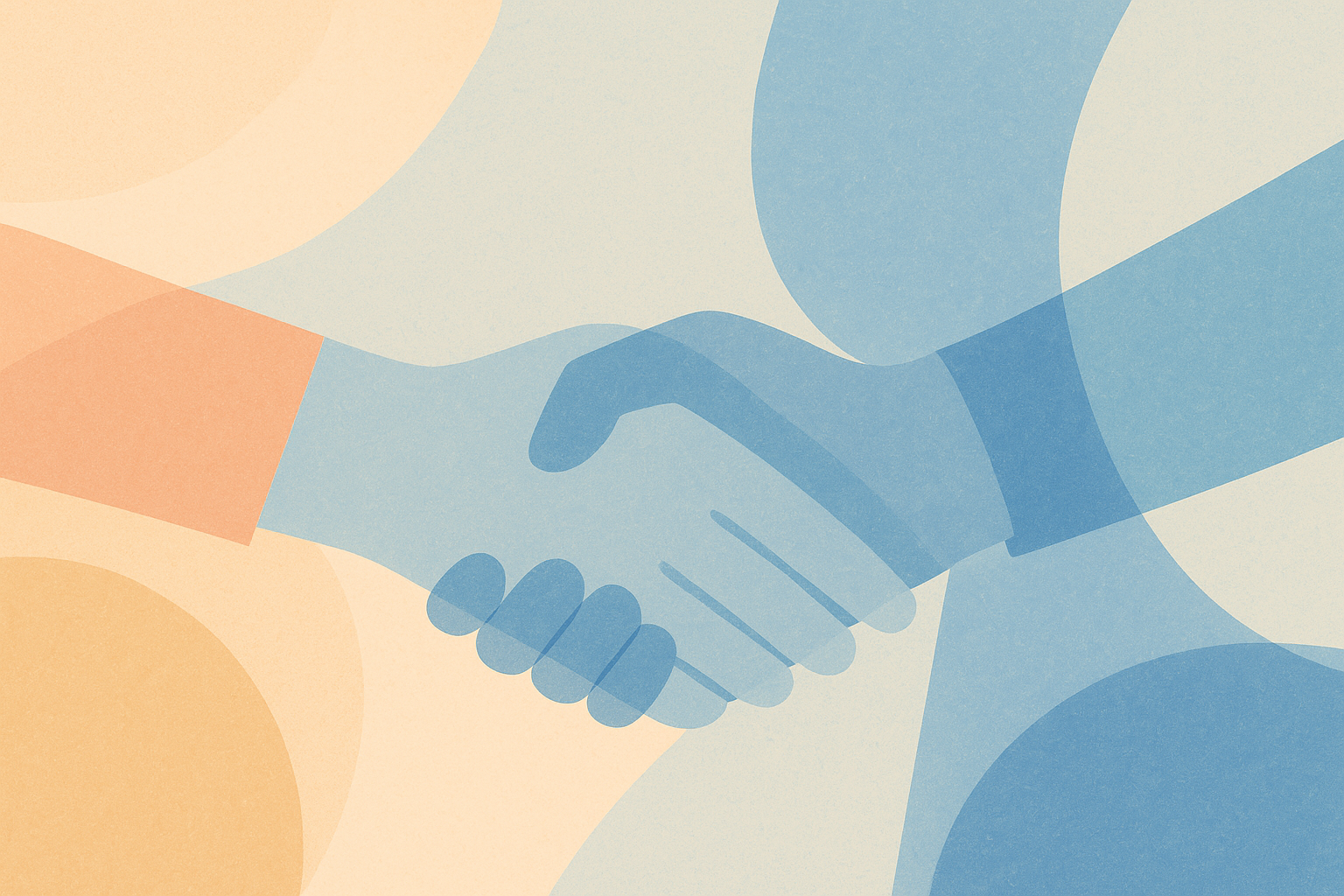 Illustration vectorielle minimaliste avec poignée de main en arrière-plan, icônes plates en bleu, orange et beige : plante en pot, enveloppe, graphique à barres, ampoule, tasse, stylo, coche, formes abstraites. Style pastel doux et professionnel, ambiance collaborative et moderne, fond crème clair.