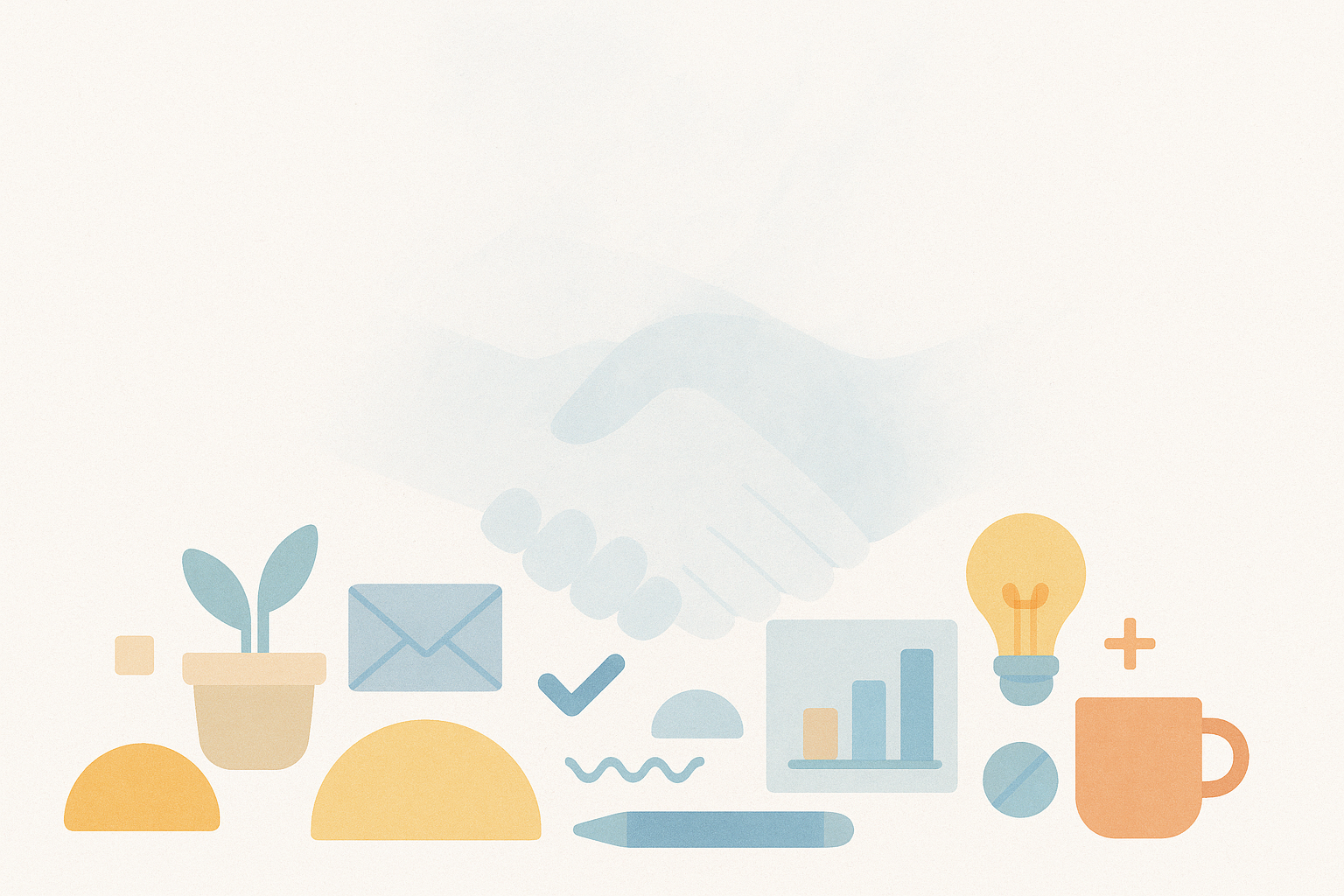 Illustration vectorielle minimaliste avec poignée de main en arrière-plan, icônes plates en bleu, orange et beige : plante en pot, enveloppe, graphique à barres, ampoule, tasse, stylo, coche, formes abstraites. Style pastel doux et professionnel, ambiance collaborative et moderne, fond crème clair.