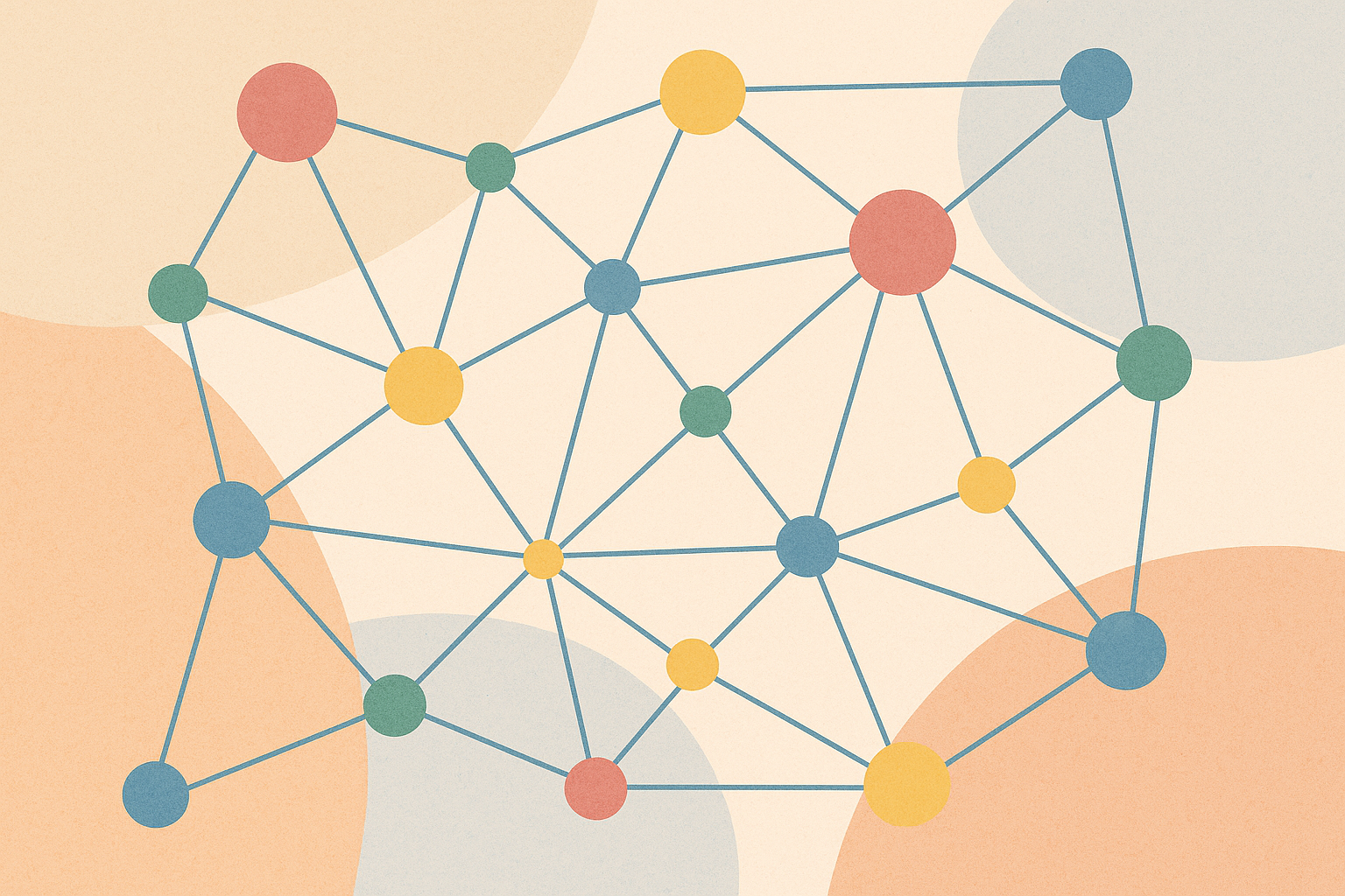 Illustration vectorielle avec des icônes colorées sur fond crème : mallette jaune, graphique bleu avec flèche rouge, bulle de dialogue rose, crayon jaune, engrenage bleu, coche verte. Style plat pastel, formes arrondies, ambiance professionnelle et moderne, parfaite pour visuels d'entreprise ou supports de communication commerciale.