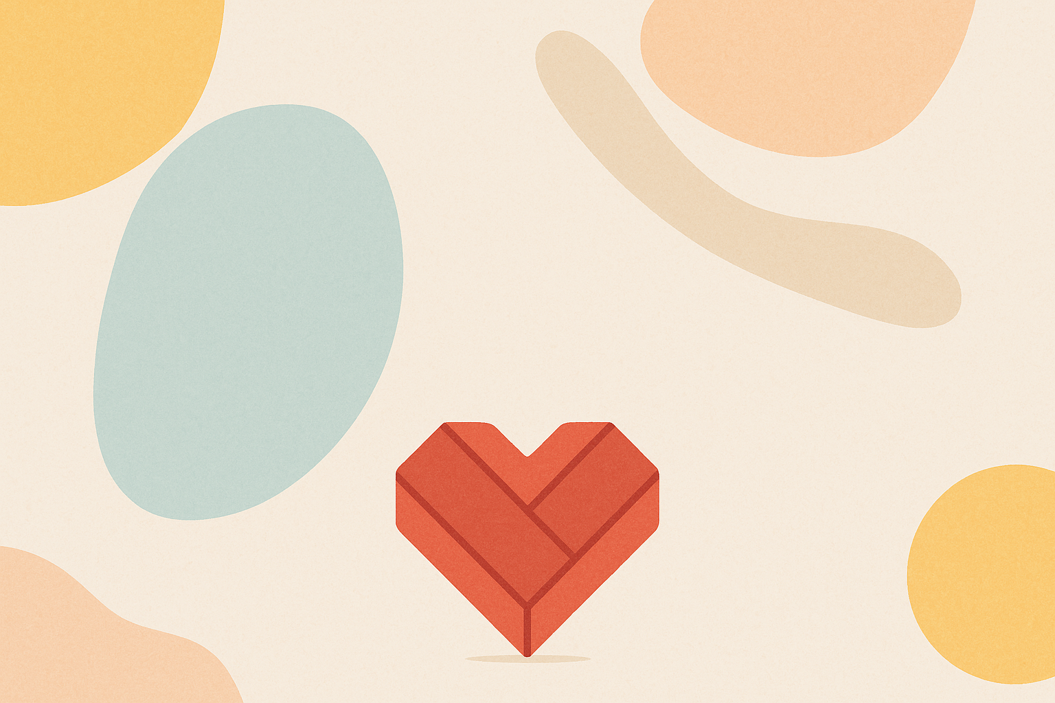 Fond beige clair avec illustrations vectorielles minimalistes en bas : cœur rouge géométrique, bougie orange, feuilles vertes, formes abstraites bleu marine, jaune moutarde et rouge brique. Style plat et pastel, ambiance chaleureuse et professionnelle, composition équilibrée avec espace vide pour texte.