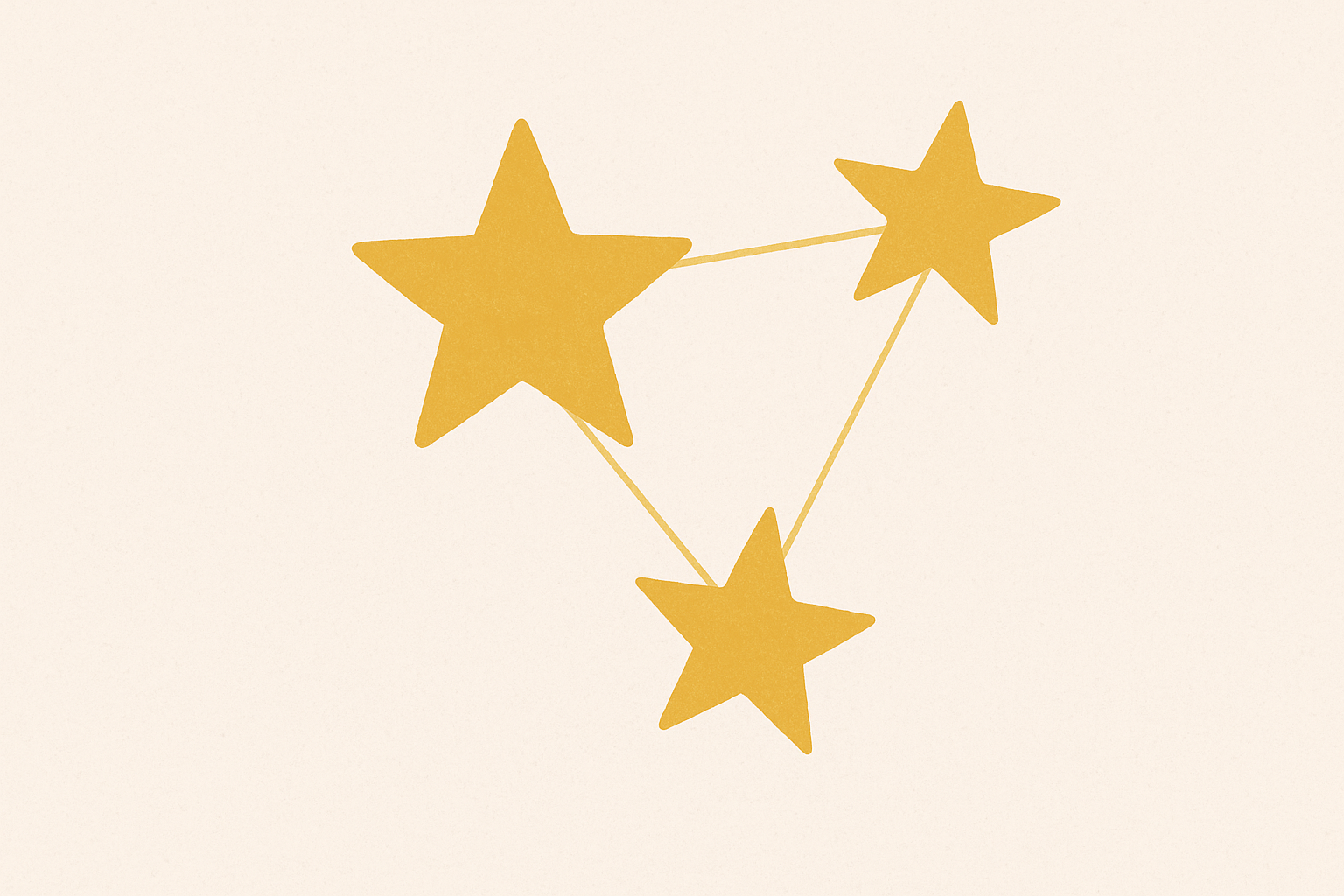 Fond crème avec illustrations minimalistes en tons pastel chauds : tasse fumante, maison rouge brique, livre ouvert, plante verte, étoiles jaunes reliées, formes abstraites et éléments naturels. Style doux, organique et moderne, évoquant confort, créativité et sérénité.