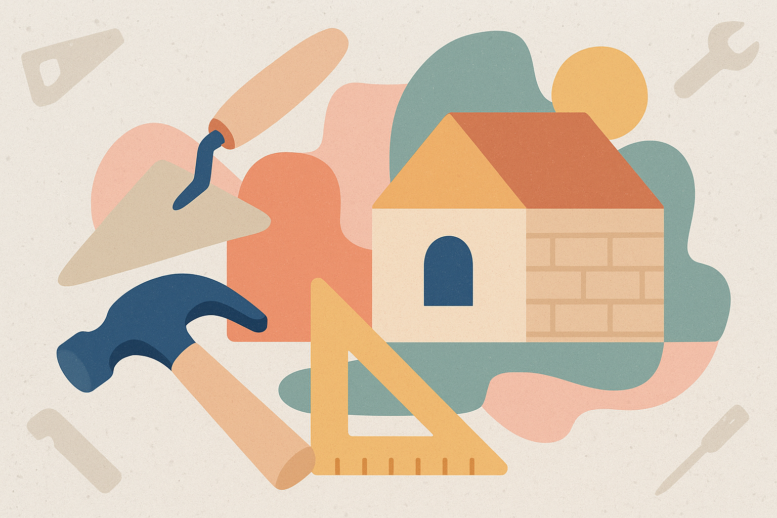 Illustration vectorielle minimaliste en bas de carte avec des icônes plates de chantier : casque jaune, truelle beige, marteau bleu, maison bleue, équerre orange, briques, formes géométriques abstraites. Palette douce en tons pastel (ocre, bleu-gris, beige, terracotta) sur fond crème texturé. Style épuré et professionnel, parfait pour le secteur BTP ou immobilier.