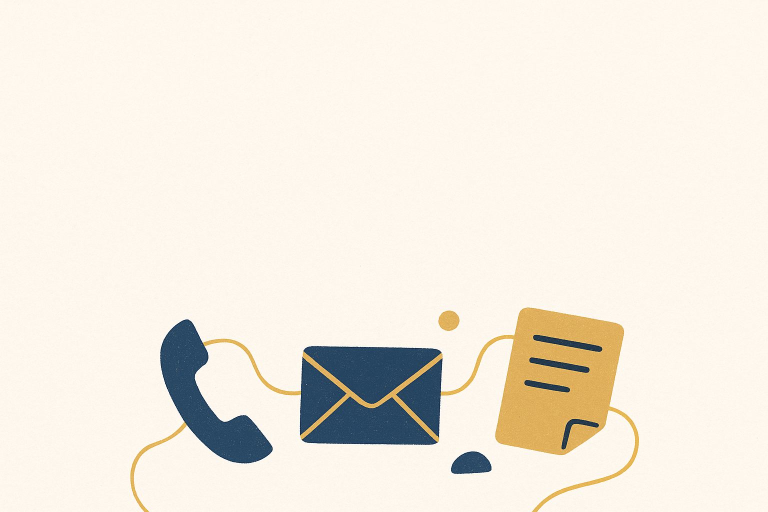 Illustration minimaliste sur fond beige clair avec trois icônes stylisées : un combiné téléphonique bleu foncé, une enveloppe bleue avec des lignes dorées, et une feuille de document dorée avec texte bleu. Les éléments sont reliés par un fil doré fluide, créant une composition équilibrée et professionnelle. Style plat, couleurs sobres bleu marine et ocre doré, ambiance moderne et épurée idéale pour supports B2B.