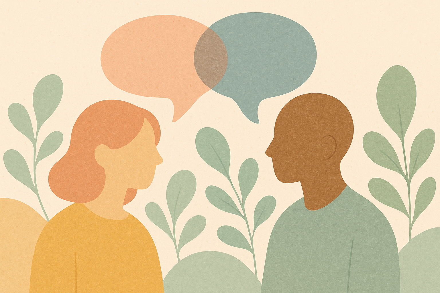 Illustration vectorielle minimaliste avec des icônes de téléphone rouge brique, enveloppe jaune, bulle de dialogue verte, formes abstraites beige et rose pâle, et fleur jaune pastel. Palette douce et naturelle avec des éléments de communication visuelle sur fond crème texturé. Style épuré et professionnel, parfait pour supports de correspondance d'affaires.