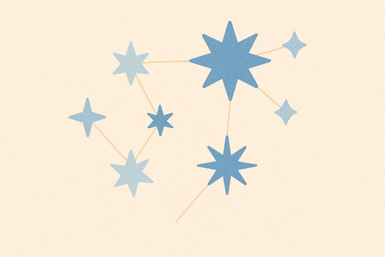 Illustration vectorielle douce avec palette pastel beige, bleu et orange. Icônes stylisées : crayon, carnet ouvert, cœur, calendrier, ampoule, cadre photo, feuilles, étoiles bleues en haut. Style minimaliste et chaleureux, ambiance de bureau créatif, éléments disposés en bas avec espace vide pour texte.
