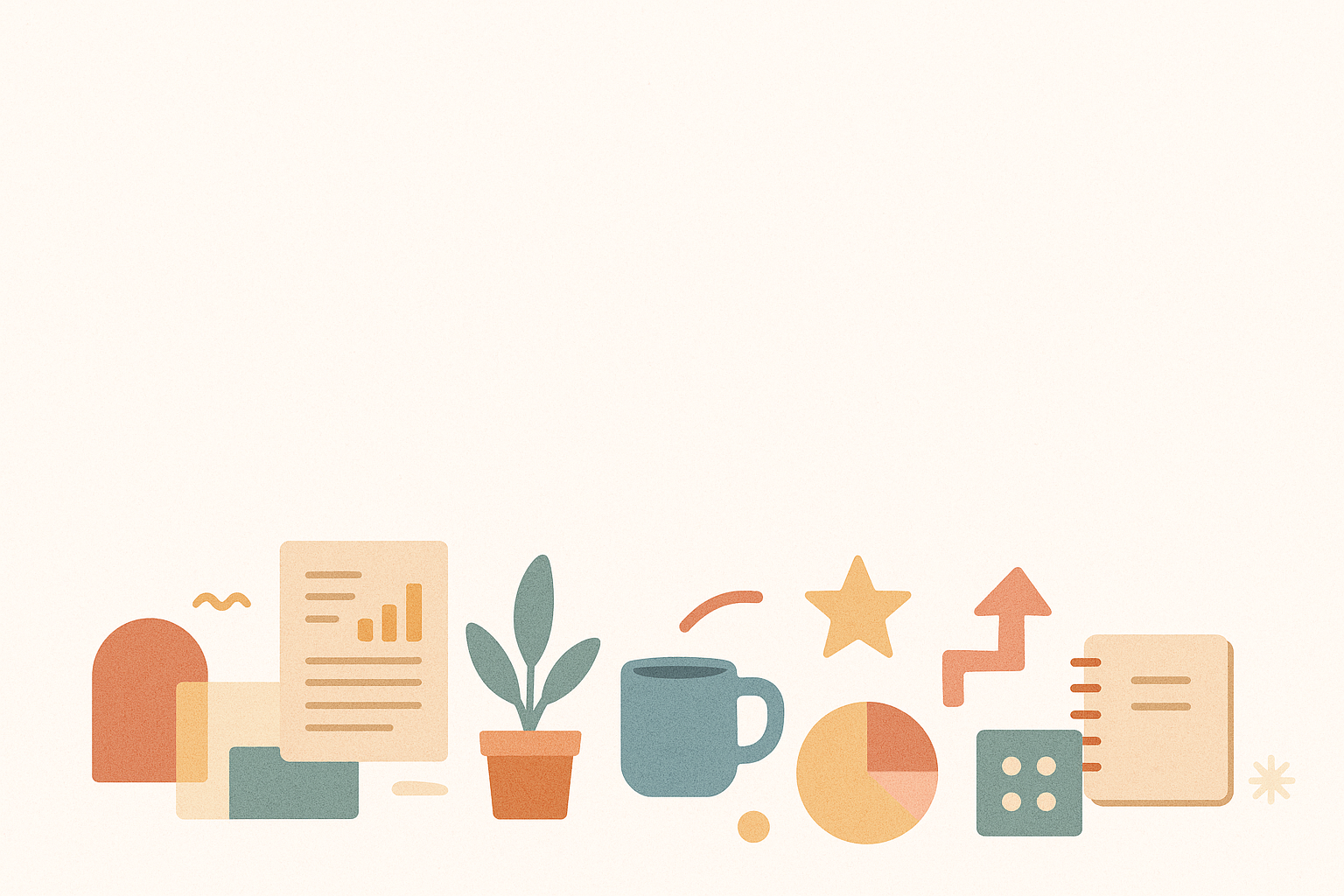 Illustration vectorielle minimaliste avec des icônes de bureau en tons pastel : tasse bleue, plante verte, documents beige, graphiques circulaires orange et jaunes, flèche rouge, carnet, étoile, et dés. Fond crème clair avec éléments plats aux contours doux, ambiance professionnelle mais conviviale, parfaite pour communication visuelle d’entreprise.