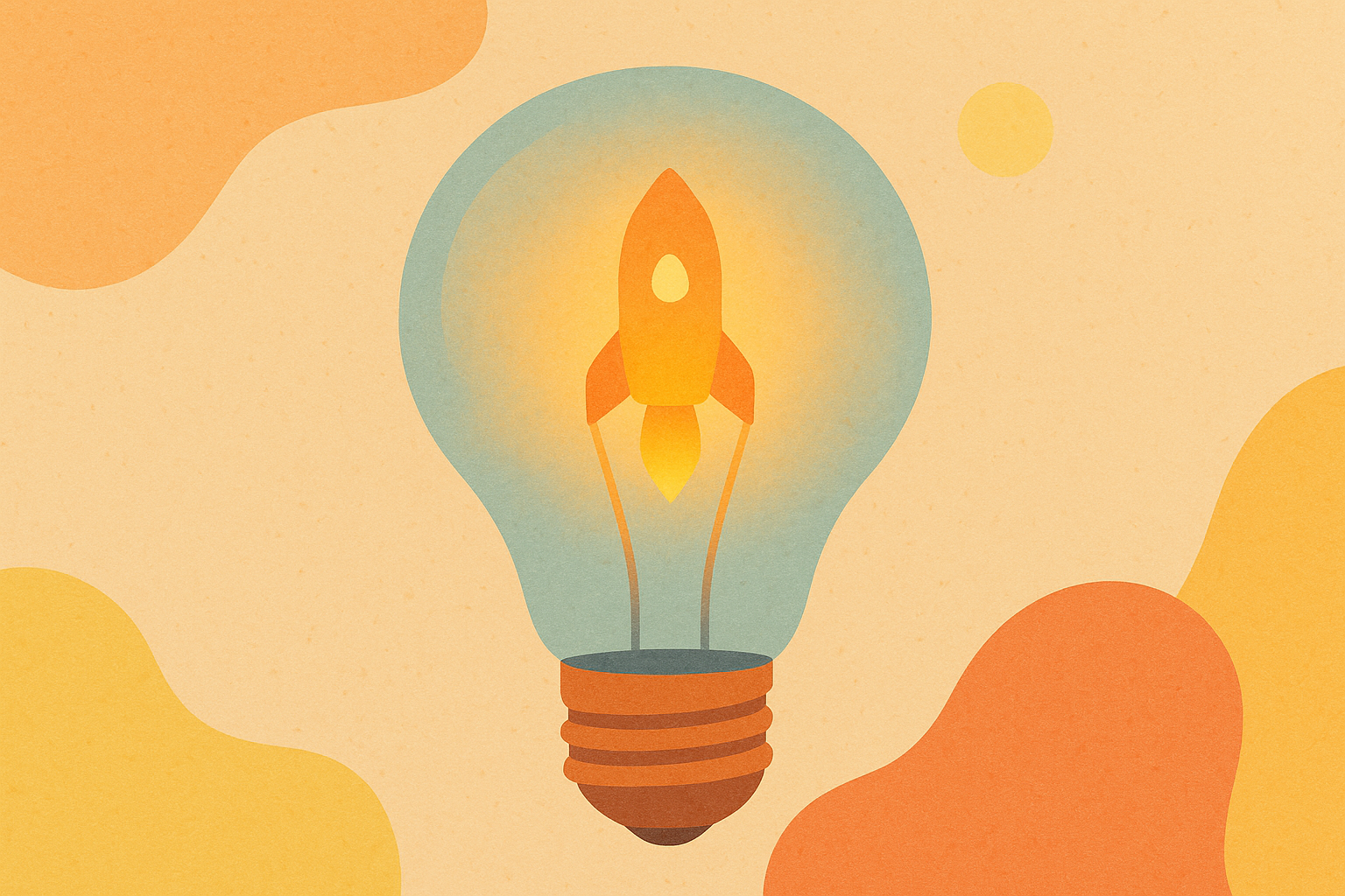 Illustration vectorielle au style plat avec des couleurs pastel douces (orange, jaune, bleu clair) représentant une ampoule avec fusée, une ampoule classique, un engrenage, un livre, une lampe de bureau et des éléments abstraits. Fond beige clair, ambiance créative et professionnelle, parfaite pour des visuels de communication d'entreprise ou de correspondance commerciale.