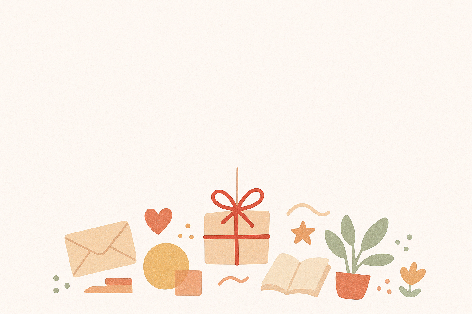 Illustration vectorielle minimaliste avec des icônes plates en tons pastel : enveloppe beige, cœur rouge, cadeau avec ruban rouge, livre ouvert, étoile, plante verte en pot, et fleur orange. Fond crème uni avec éléments décoratifs géométriques et organiques. Style doux, chaleureux et professionnel, parfait pour la communication visuelle d'entreprise.