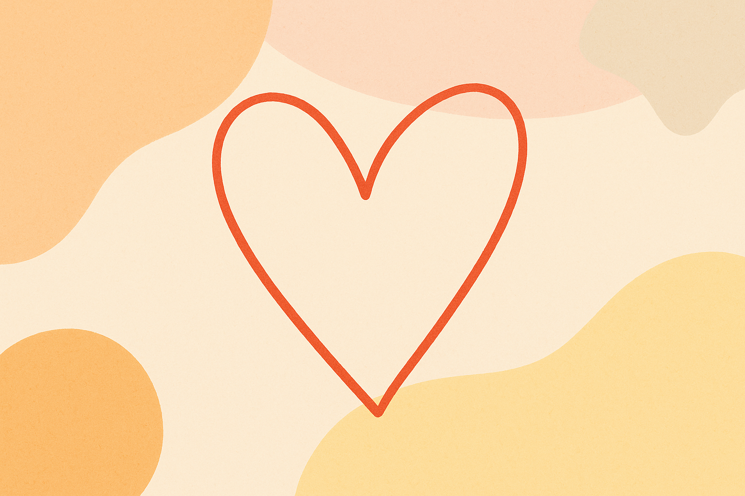 Illustration minimaliste avec un grand cœur rouge au centre, entouré d’éléments visuels plats en tons pastel : tasse orange, enveloppe beige avec cœur, bougie rouge, fleurs et cœurs verts. Palette de couleurs douces (orange, vert sauge, beige, rouge clair) sur fond crème. Style épuré et chaleureux, parfait pour ambiance bienveillante et professionnelle.