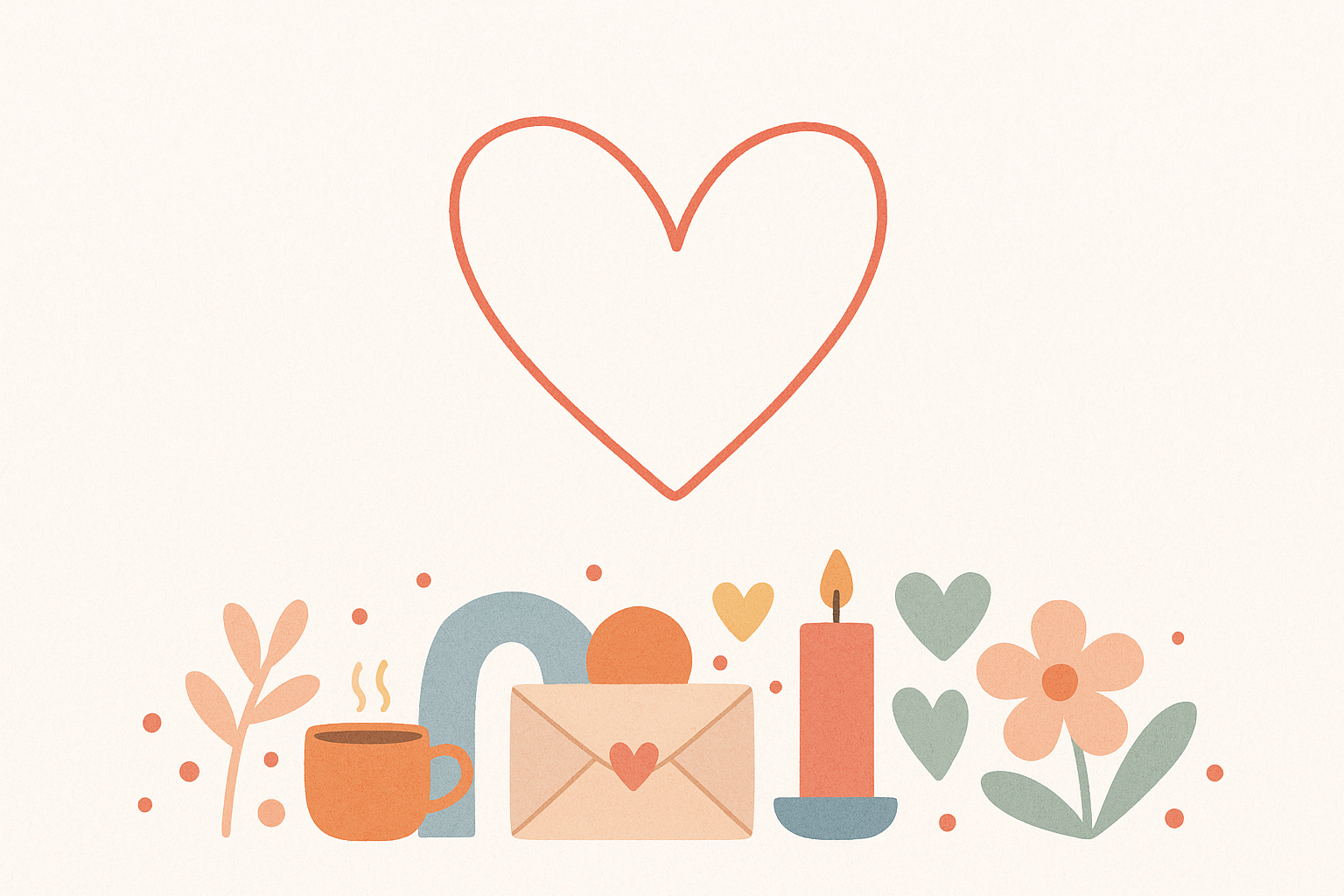 Illustration minimaliste avec un grand cœur rouge au centre, entouré d’éléments visuels plats en tons pastel : tasse orange, enveloppe beige avec cœur, bougie rouge, fleurs et cœurs verts. Palette de couleurs douces (orange, vert sauge, beige, rouge clair) sur fond crème. Style épuré et chaleureux, parfait pour ambiance bienveillante et professionnelle.