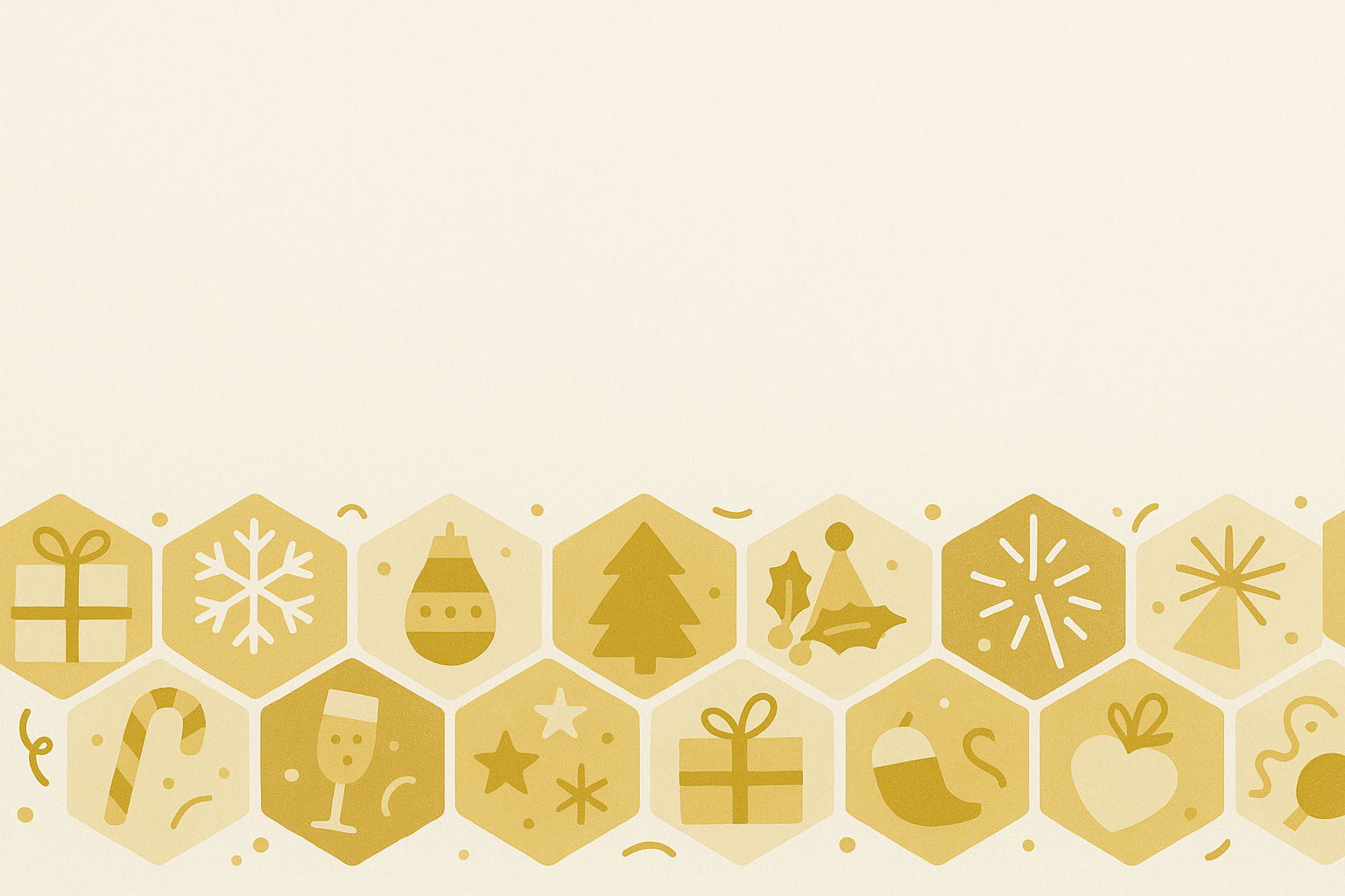 Fond crème avec une bande inférieure composée d’hexagones dorés contenant des icônes festives : cadeaux, flocon, sapin, cloche, étoile, verre, houx, cœur, feu d’artifice, chapeau de fête. Palette monochrome dorée sur fond clair, style minimaliste et géométrique, ambiance chaleureuse et professionnelle, parfaite pour les cartes de vœux d’entreprise ou les communications saisonnières.