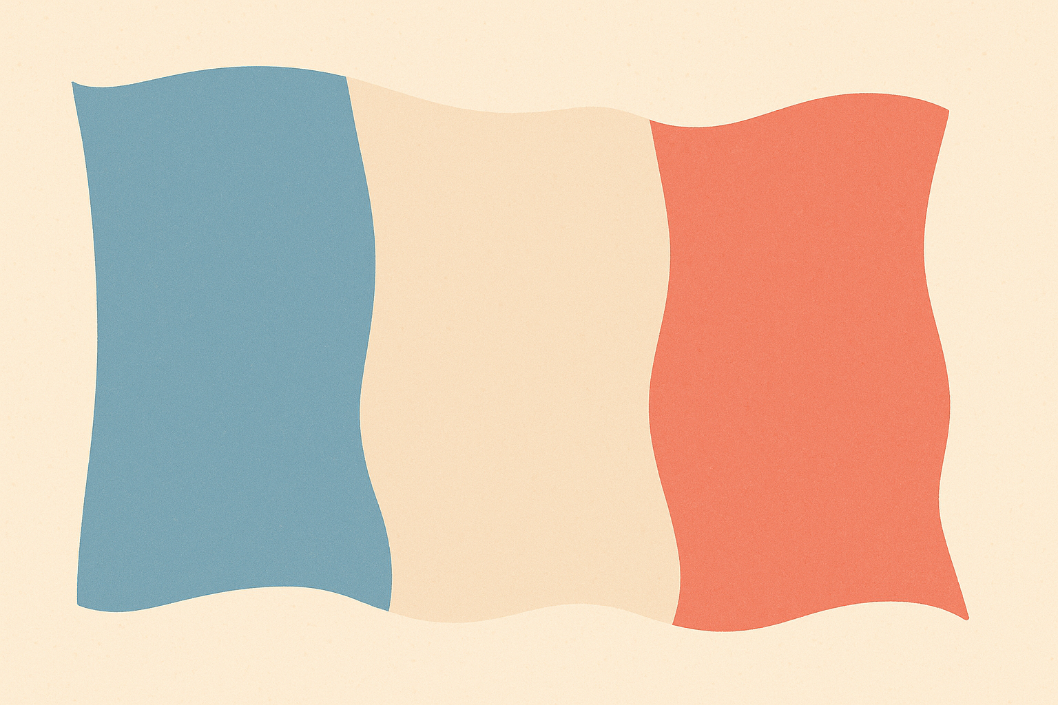 Illustration vectorielle en style plat avec un drapeau français ondulant en bleu, blanc et rouge, accompagné d’icônes pastel : enveloppe, appareil photo, tulipe, cœur, tour Eiffel, livre, étoile, lettres stylisées et verre de vin rouge. Palette douce beige, bleu et rouge, ambiance chaleureuse et professionnelle, parfaite pour des visuels de correspondance d'affaires ou de communication institutionnelle.