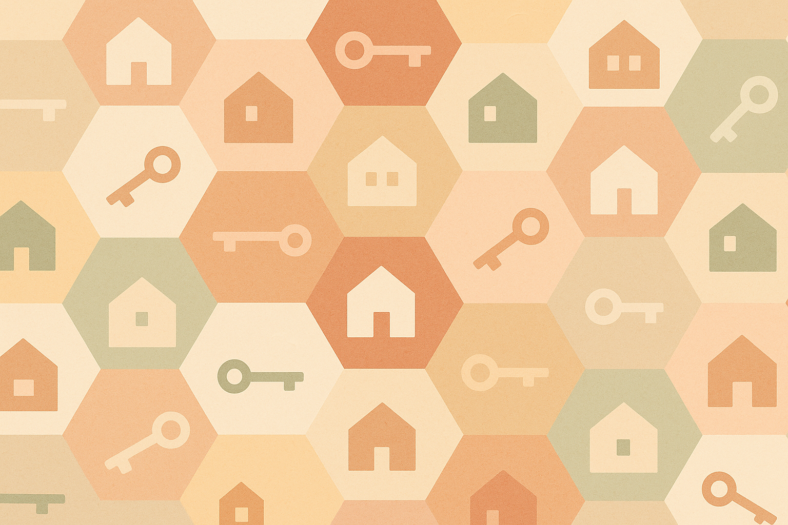 Fond crème avec une rangée d’hexagones pastel contenant des icônes marron et beige représentant des clés, maisons, immeubles et bâtiments institutionnels. Style minimaliste, palette de couleurs douces (beige, sable, caramel, taupe), formes géométriques nettes, ambiance professionnelle et sobre.