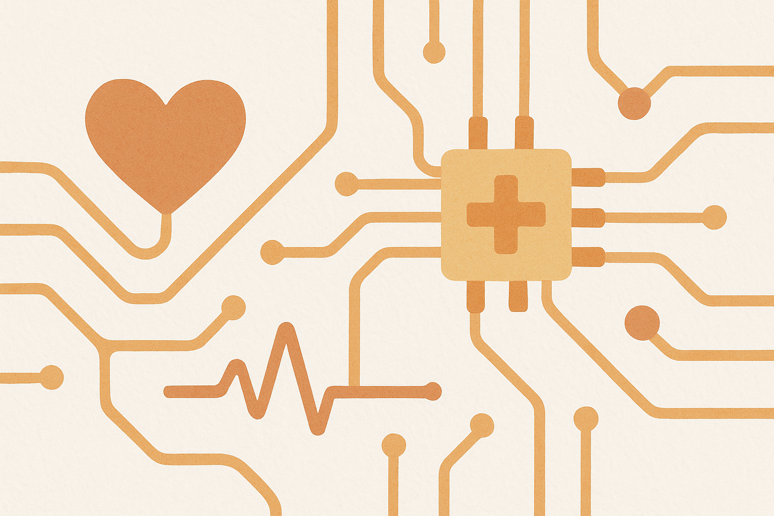 Illustration vectorielle minimaliste avec des icônes médicales en tons chauds (ocre, beige, terracotta) sur fond blanc texturé. On y trouve un stéthoscope, une pilule, un flacon de médicament, un cœur avec tracé ECG, un pansement et des symboles de croix médicales. Style épuré, formes arrondies, ambiance professionnelle et rassurante, idéale pour le secteur de la santé.