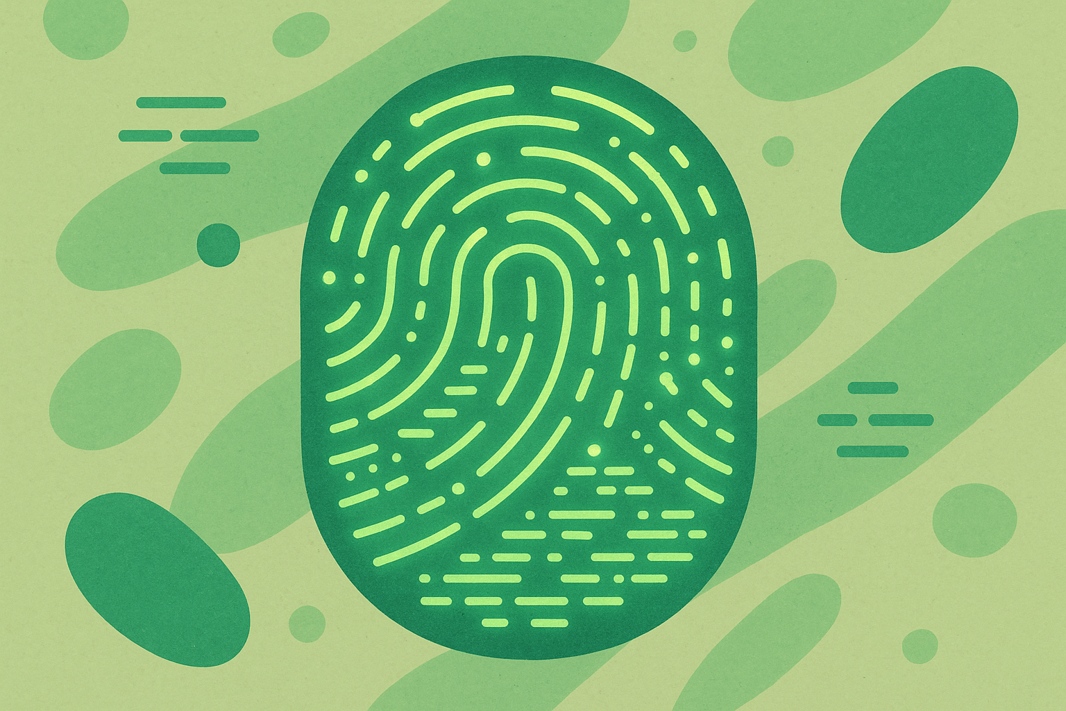 Fond crème avec illustrations vectorielles plates en tons pastel (vert sauge, terracotta, beige, ocre). Éléments visuels : empreinte digitale stylisée, ordinateur portable, bulle de discussion, smartphone, plante en pot, lampe de bureau, formes géométriques abstraites. Style minimaliste et moderne, ambiance digitale et professionnelle.