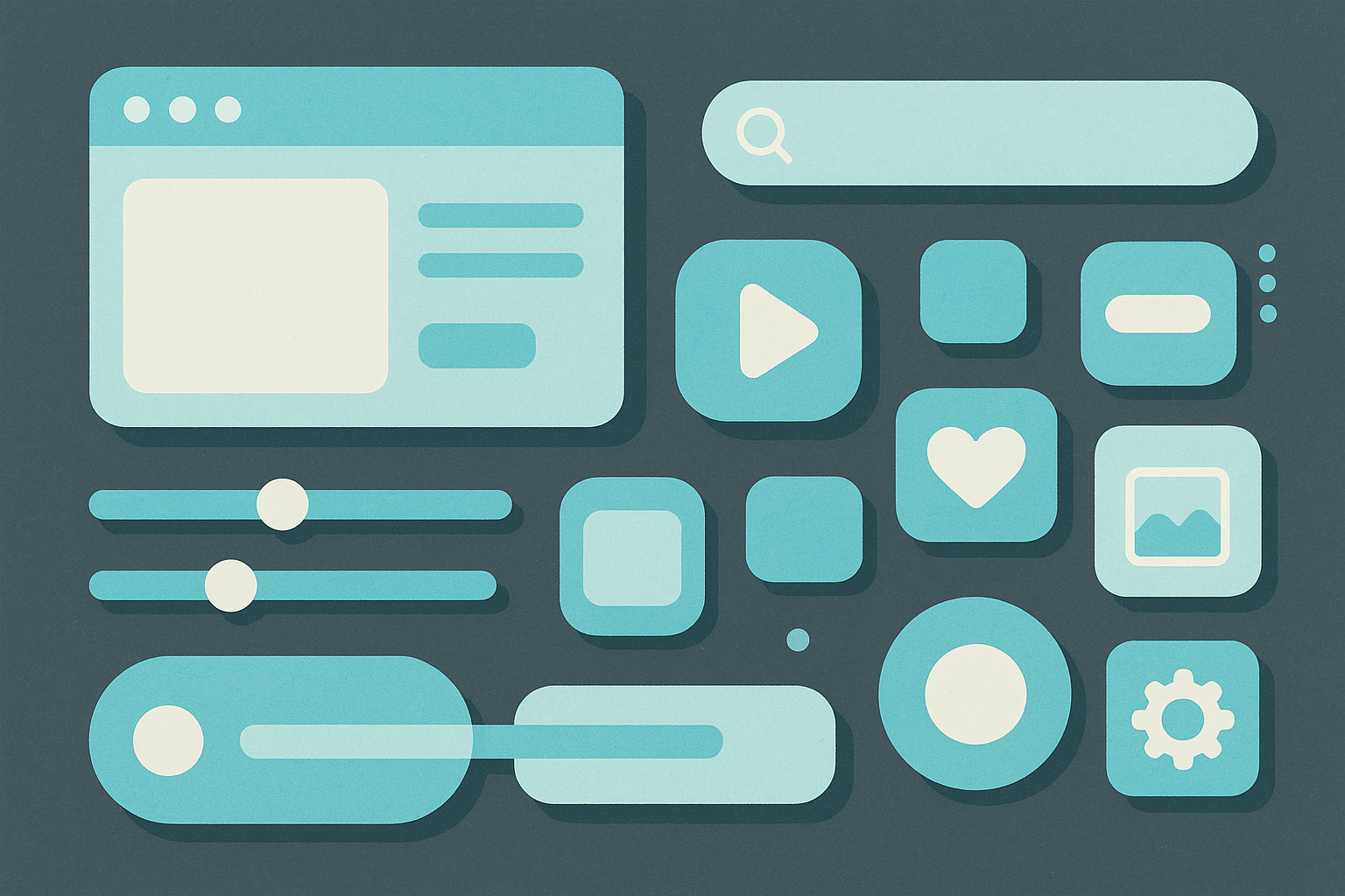Fond crème avec une rangée d’icônes bleues aux formes arrondies en bas de l’image : cœurs, flèches, cases cochées, curseurs, boutons et éléments d’interface utilisateur. Palette de bleus pastel et turquoise, style minimaliste et numérique, ambiance moderne et épurée. Composition horizontale avec espace vide en haut pour texte ou logo.