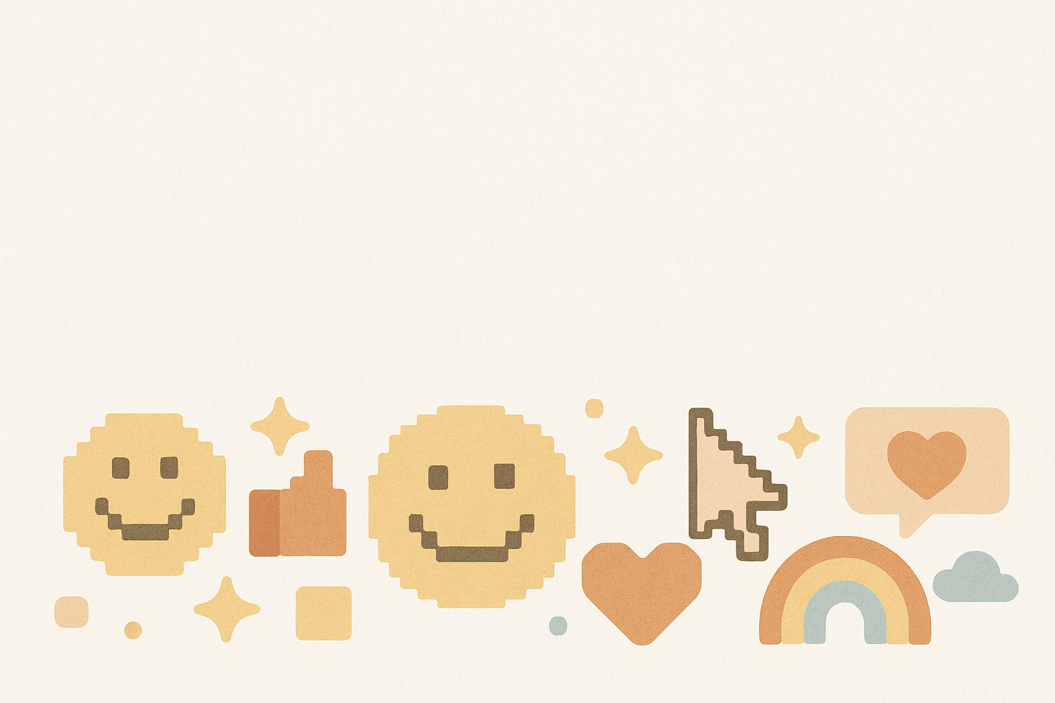 Fond beige clair avec des icônes pixelisées rétro dans des tons pastel doux (jaune moutarde, orange terre cuite, bleu ciel, beige). Éléments visuels : smileys, cœur, pouce levé, flèche de curseur, arc-en-ciel, bulles de dialogue, étoiles scintillantes. Style minimaliste et ludique, parfait pour des cartes postales professionnelles au ton amical et moderne.