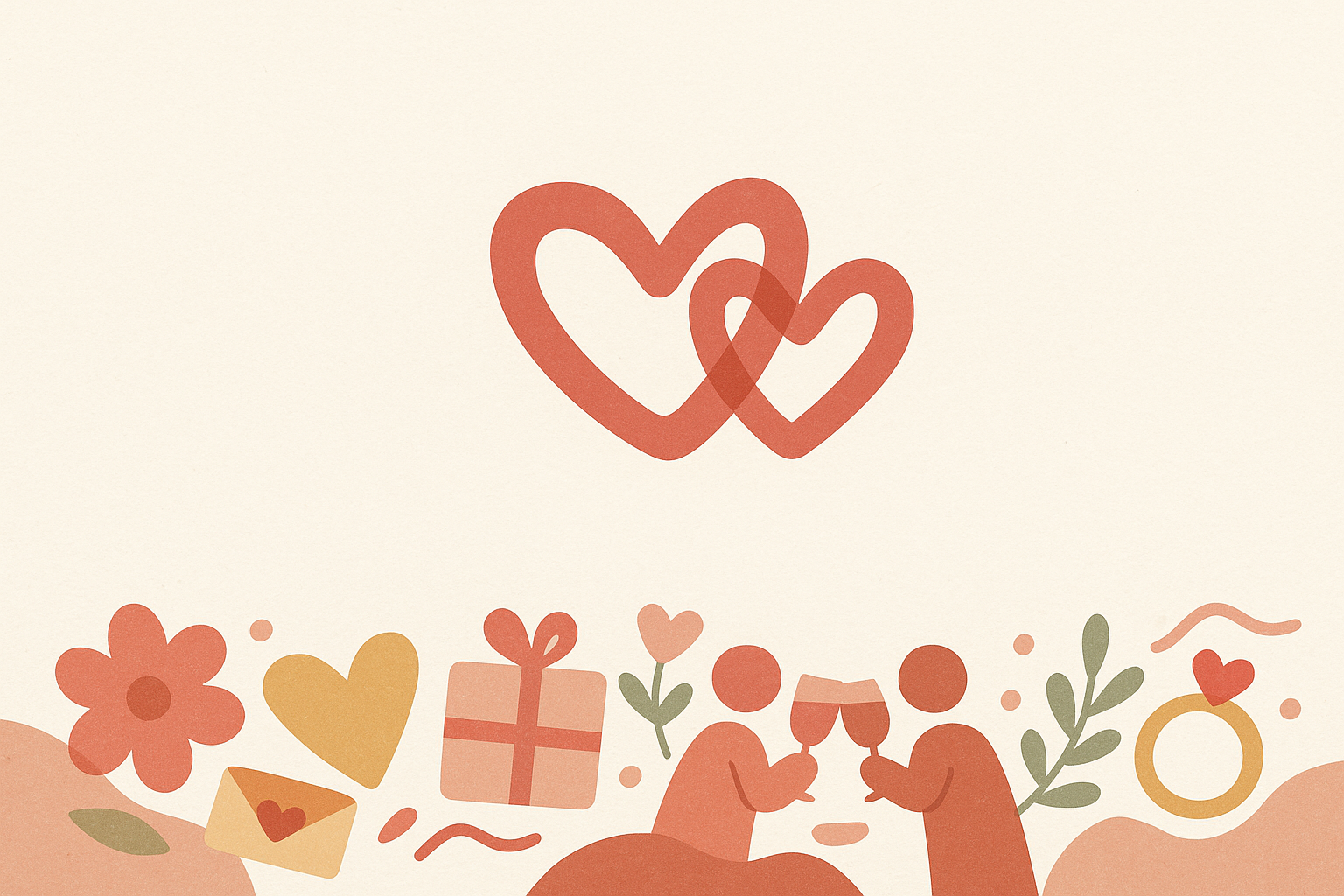 Illustration vectorielle minimaliste sur fond crème avec deux cœurs rouges entrelacés au centre, entourés d’éléments décoratifs en bas : fleurs stylisées, cœur jaune, enveloppe, cadeau, couple trinquant, bague, feuilles et tulipe. Palette de couleurs douces en tons pastel : rouge brique, rose saumon, jaune moutarde et vert olive. Style plat et chaleureux, parfait pour une ambiance romantique et professionnelle.
