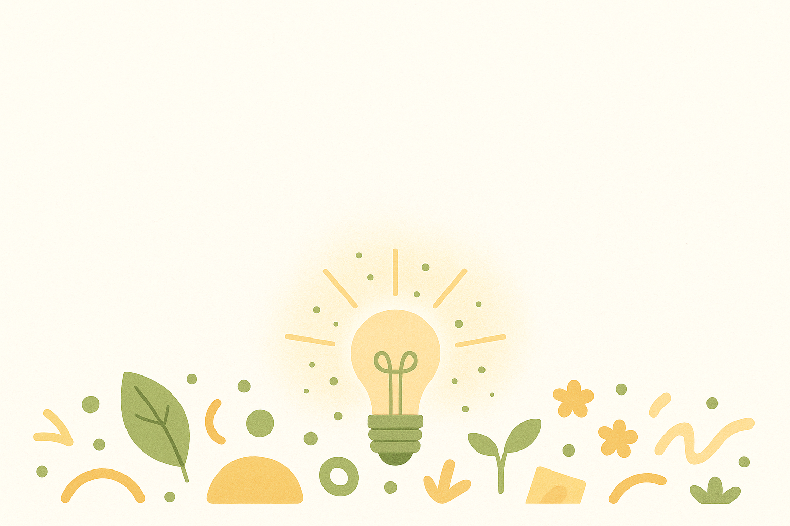 Illustration minimaliste avec une ampoule jaune au centre, entourée de feuilles vertes, fleurs orange, formes géométriques et abstraites sur fond crème. Couleurs douces en tons pastel vert, jaune et orange. Style épuré, ambiance naturelle et créative, parfaite pour des thèmes d'innovation, écologie ou développement durable.