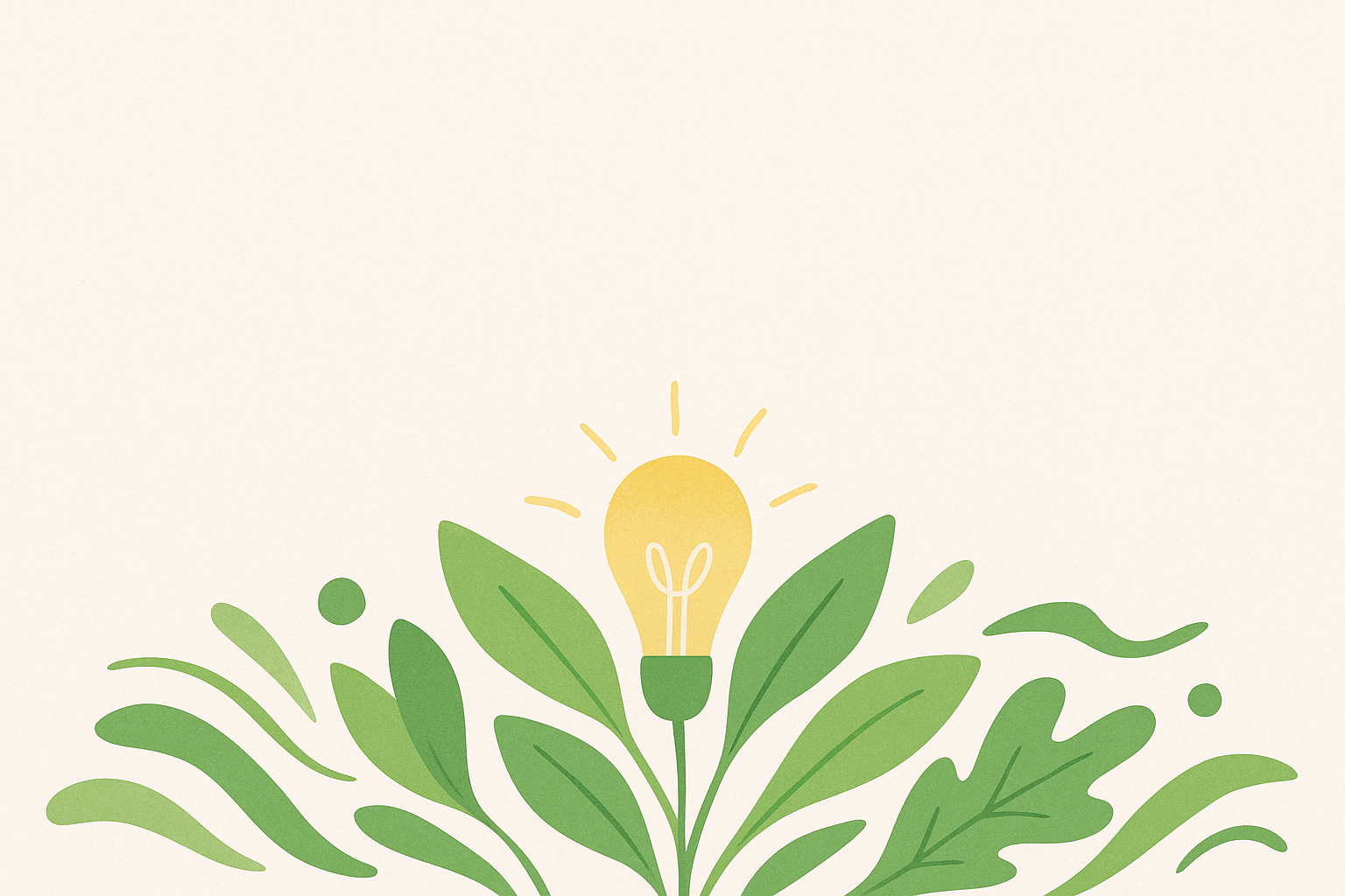 Illustration vectorielle sur fond beige clair avec une ampoule jaune stylisée au centre, entourée de feuilles vertes aux formes organiques et dynamiques. Le style est épuré, avec des éléments graphiques fluides et une palette de couleurs naturelles (vert clair, vert foncé, jaune doux). L’image évoque l’innovation, la nature et l’énergie renouvelable, parfaite pour des cartes postales professionnelles à thème écologique ou créatif.