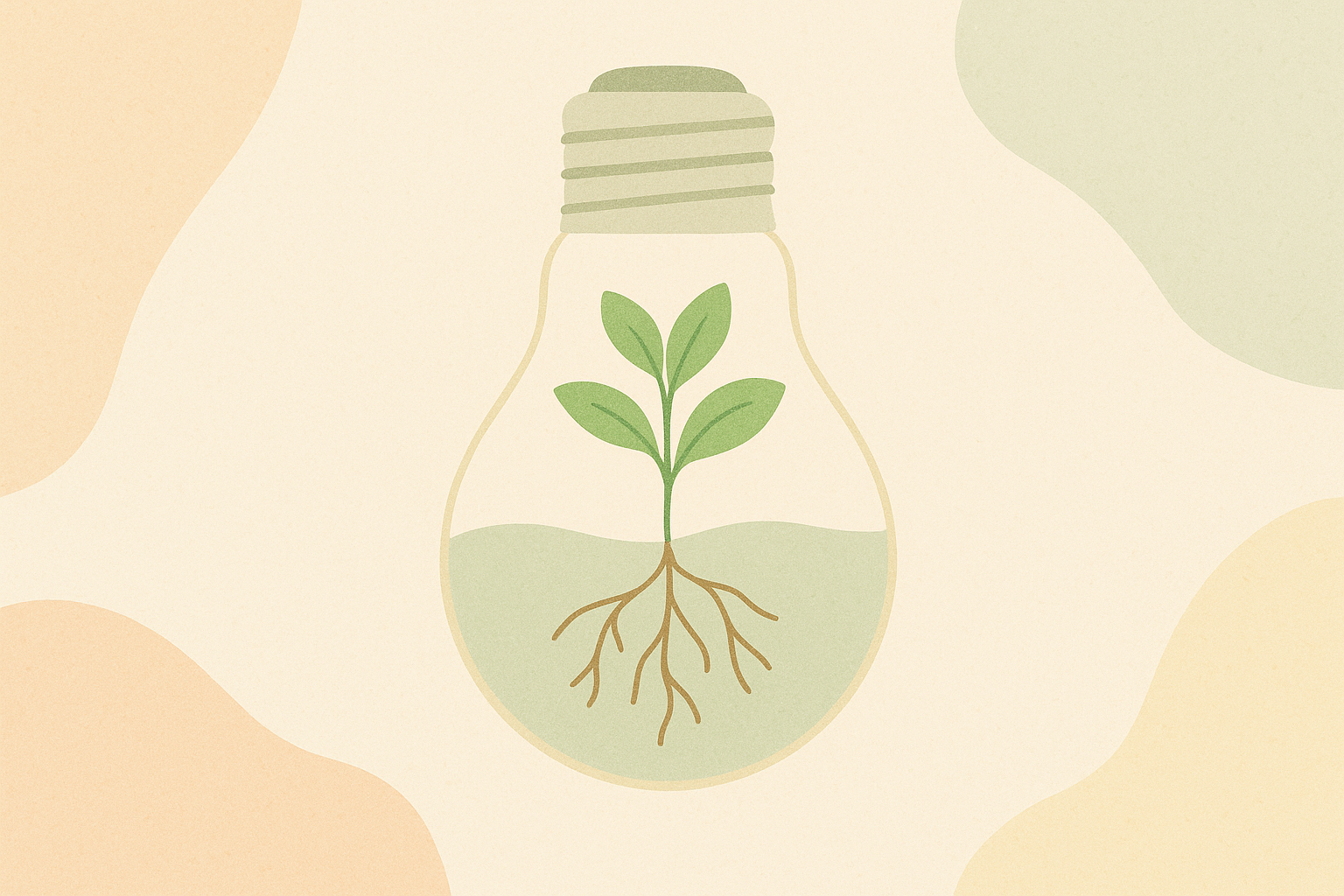 Illustration minimaliste avec une ampoule beige contenant une plante verte aux racines visibles, sur fond crème. En bas, une frise de pictogrammes verts et jaunes évoque le recyclage, la croissance, la nature et l’énergie renouvelable. Style doux et épuré, couleurs pastel naturelles, formes arrondies et symboles écologiques.