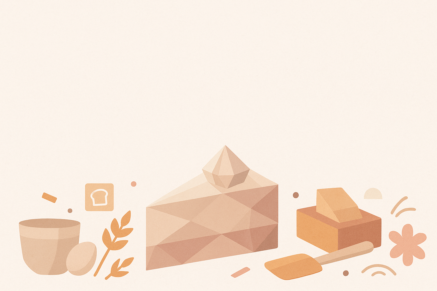 Illustration vectorielle en tons pastel beige, caramel et rose, représentant des éléments de pâtisserie : pain stylisé en forme géométrique, beurre, spatule, œuf, bol, épi de blé, icône de tranche de pain et fleur décorative. Composition minimaliste avec espace vide en haut pour texte, ambiance douce et professionnelle, parfaite pour design de carte postale d’entreprise.