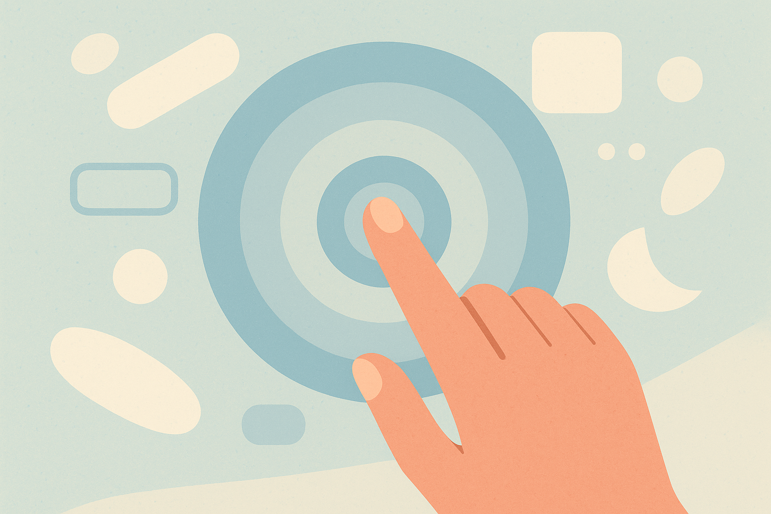 Illustration minimaliste aux tons neutres beige et gris, représentant une main touchant un écran avec des icônes numériques comme une empreinte digitale, un curseur, des ondes Wi-Fi et des cercles concentriques. Le style est plat, vectoriel et épuré, avec des formes arrondies et des éléments abstraits évoquant l'interface utilisateur et la technologie tactile.