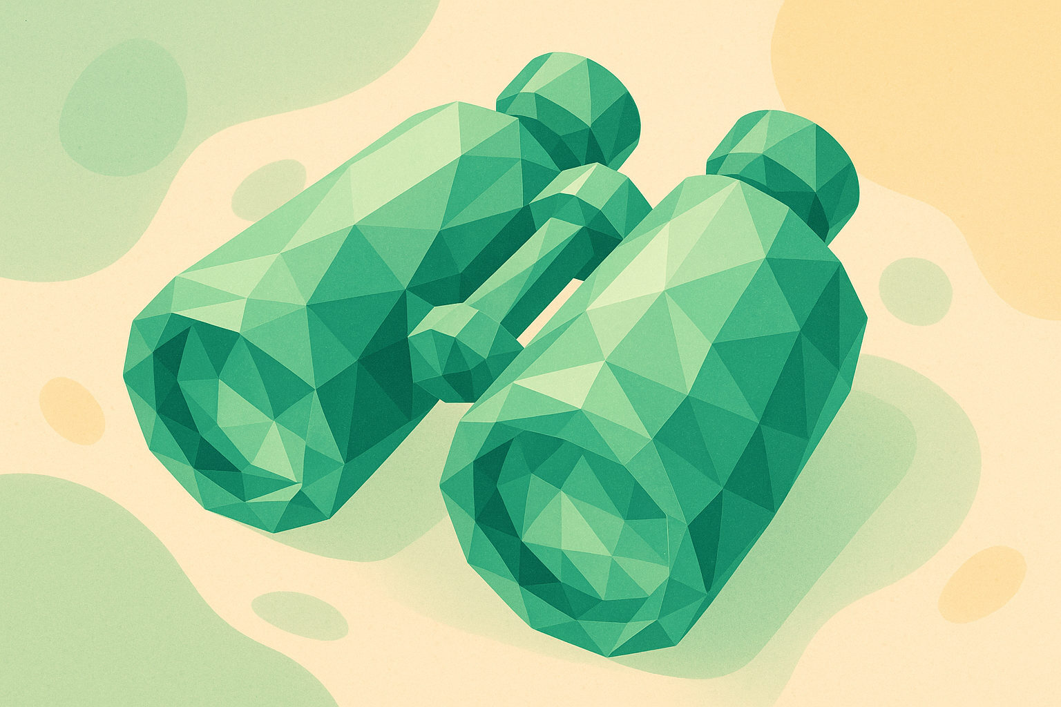 Illustration vectorielle de jumelles en style géométrique, avec des formes angulaires et facettées en dégradés de vert menthe et émeraude sur fond beige clair. Des éléments décoratifs abstraits comme des étoiles, gouttes, cercles et triangles entourent l'objet principal. Style plat, texturé, pastel et minimaliste, parfait pour un usage professionnel ou créatif.