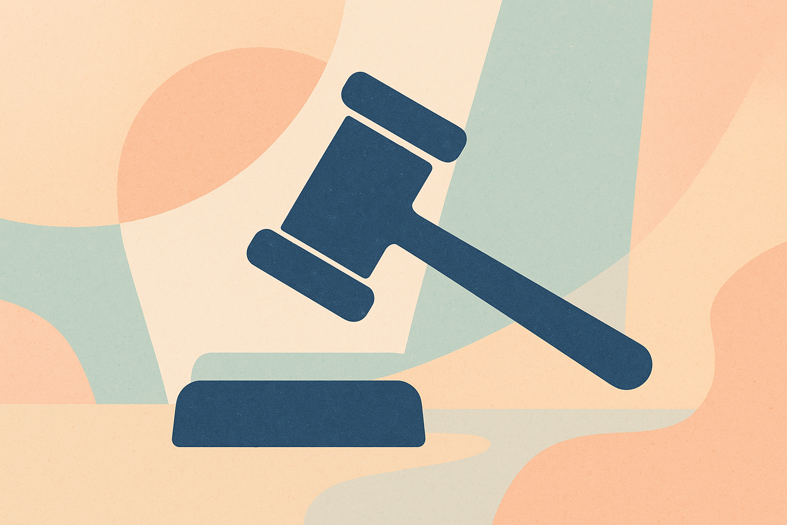 Illustration abstraite avec un marteau de juge bleu marine, une balance orange, des formes géométriques simples (cercles, triangles, rectangles) dans des tons pastel (bleu, beige, orange, vert doux) sur fond crème. Style minimaliste et épuré, évoquant le droit, la justice et l'équilibre, parfait pour un usage professionnel ou institutionnel.