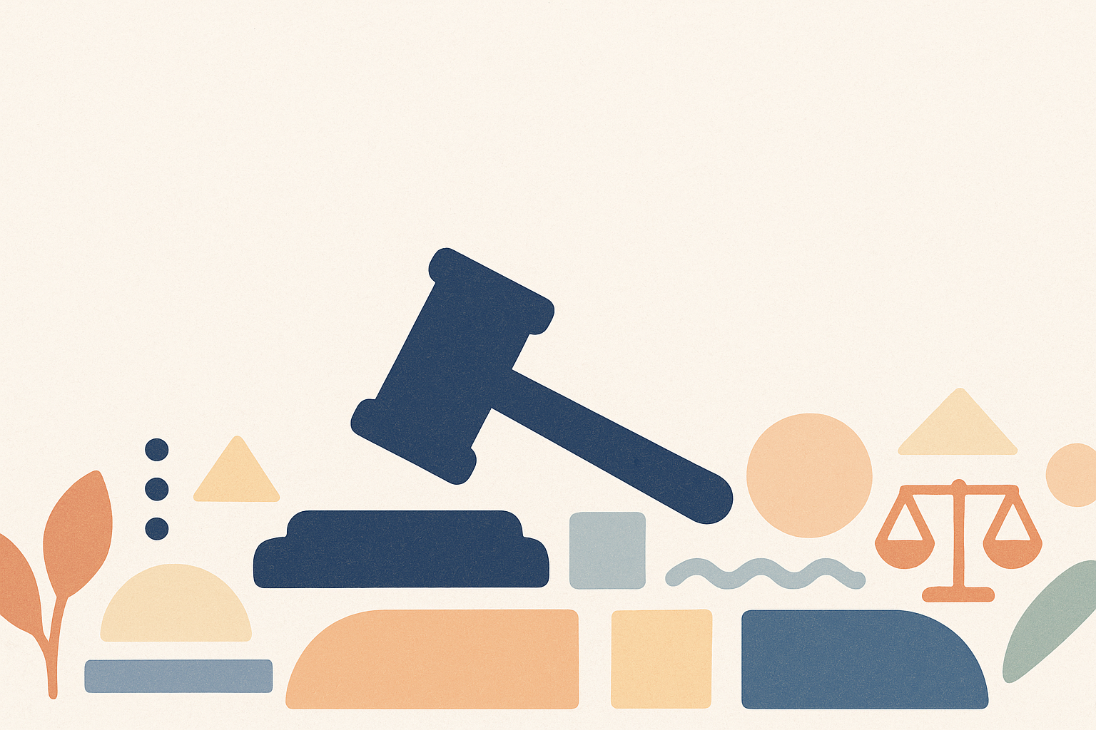 Illustration abstraite avec un marteau de juge bleu marine, une balance orange, des formes géométriques simples (cercles, triangles, rectangles) dans des tons pastel (bleu, beige, orange, vert doux) sur fond crème. Style minimaliste et épuré, évoquant le droit, la justice et l'équilibre, parfait pour un usage professionnel ou institutionnel.