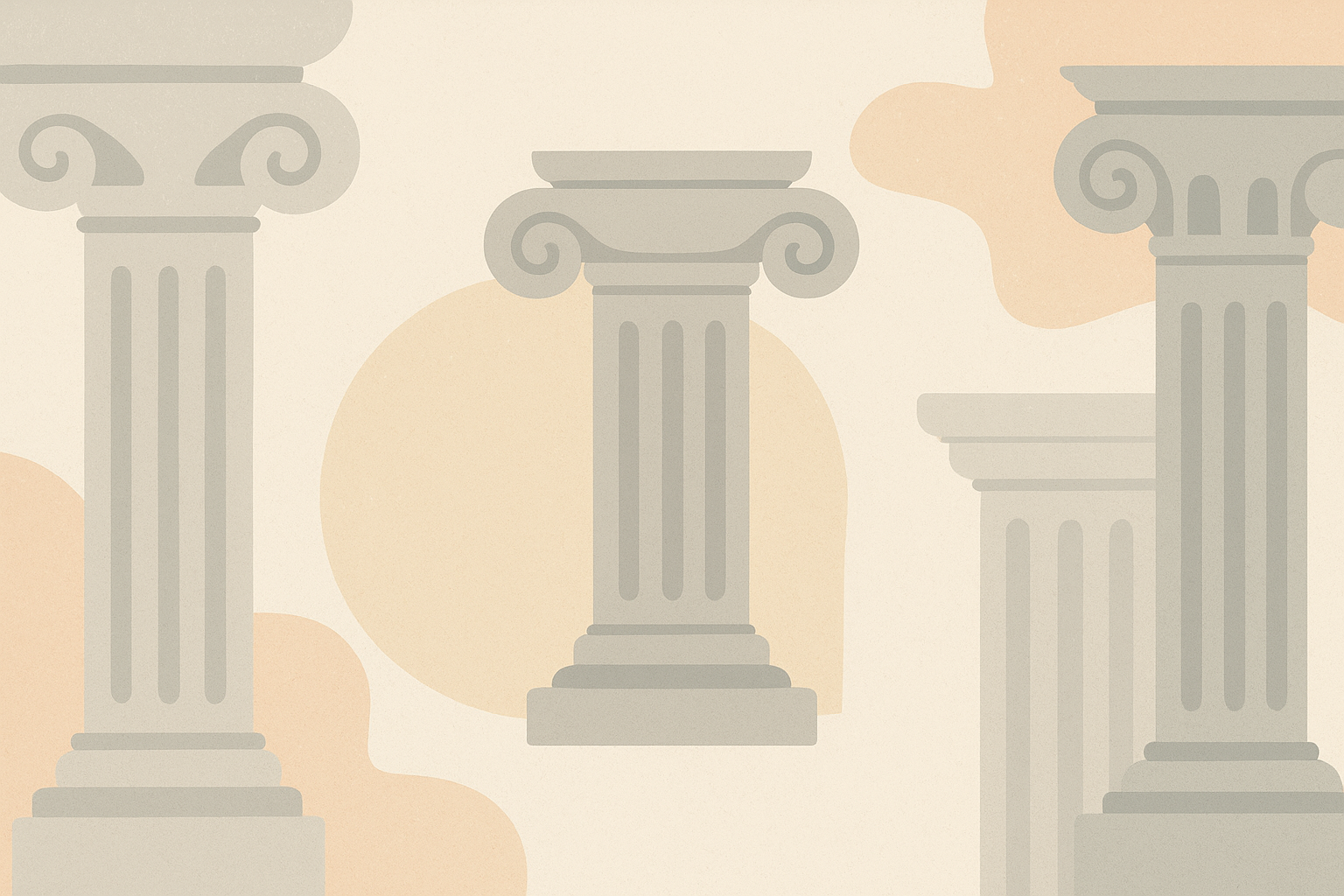 Illustration vectorielle dans des tons beige, ocre et brun clair représentant des éléments juridiques : balance de justice, marteau de juge, livre de droit, symbole paragraphe (§), colonnes classiques et bâtiment de tribunal stylisé. Style épuré, symétrique et professionnel, avec un fond crème neutre adapté à une communication formelle.
