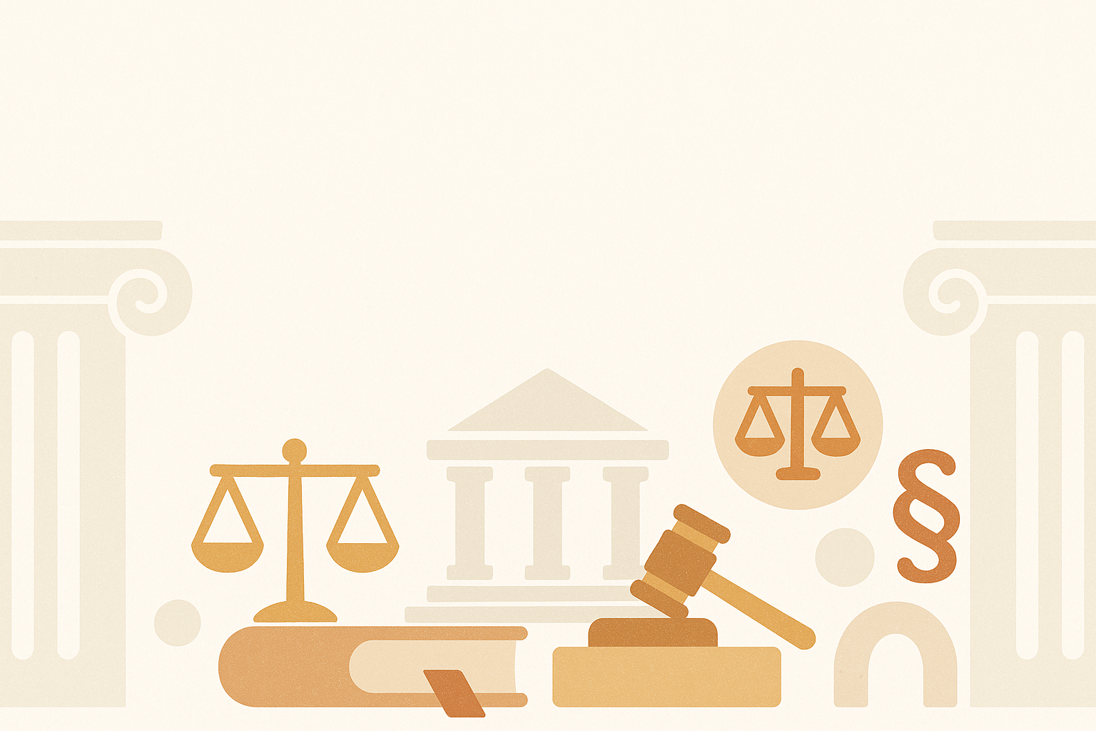 Illustration vectorielle dans des tons beige, ocre et brun clair représentant des éléments juridiques : balance de justice, marteau de juge, livre de droit, symbole paragraphe (§), colonnes classiques et bâtiment de tribunal stylisé. Style épuré, symétrique et professionnel, avec un fond crème neutre adapté à une communication formelle.
