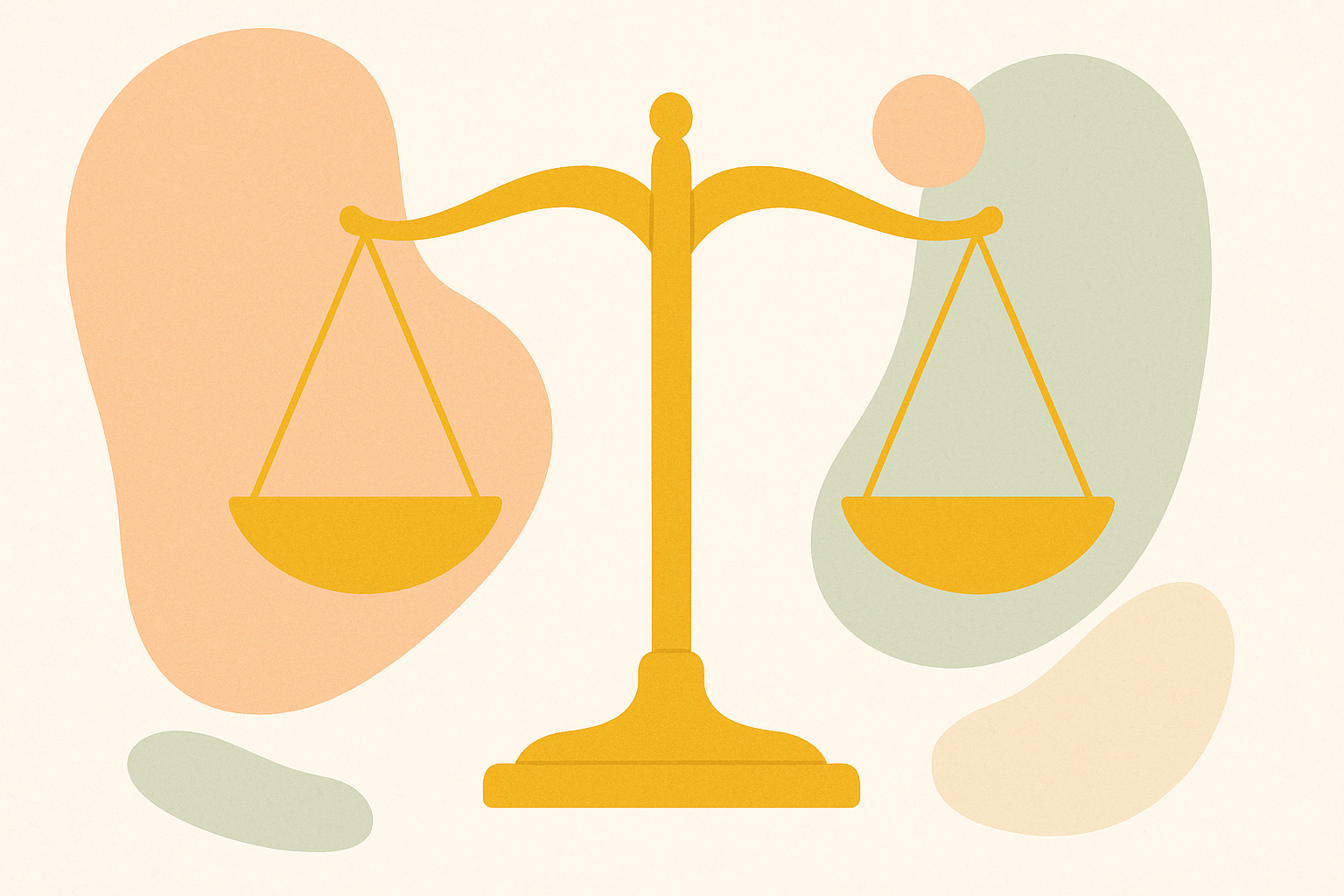 Illustration vectorielle avec balance dorée de la justice au centre, entourée d’éléments symboliques comme un livre, une colonne grecque, un document officiel, des feuilles vertes, une étoile, une coche et un cœur. Palette de couleurs douces et pastel (ocre, vert sauge, beige, terracotta), style épuré et minimaliste sur fond crème clair. Composition symétrique et harmonieuse, parfaite pour un usage professionnel ou juridique.