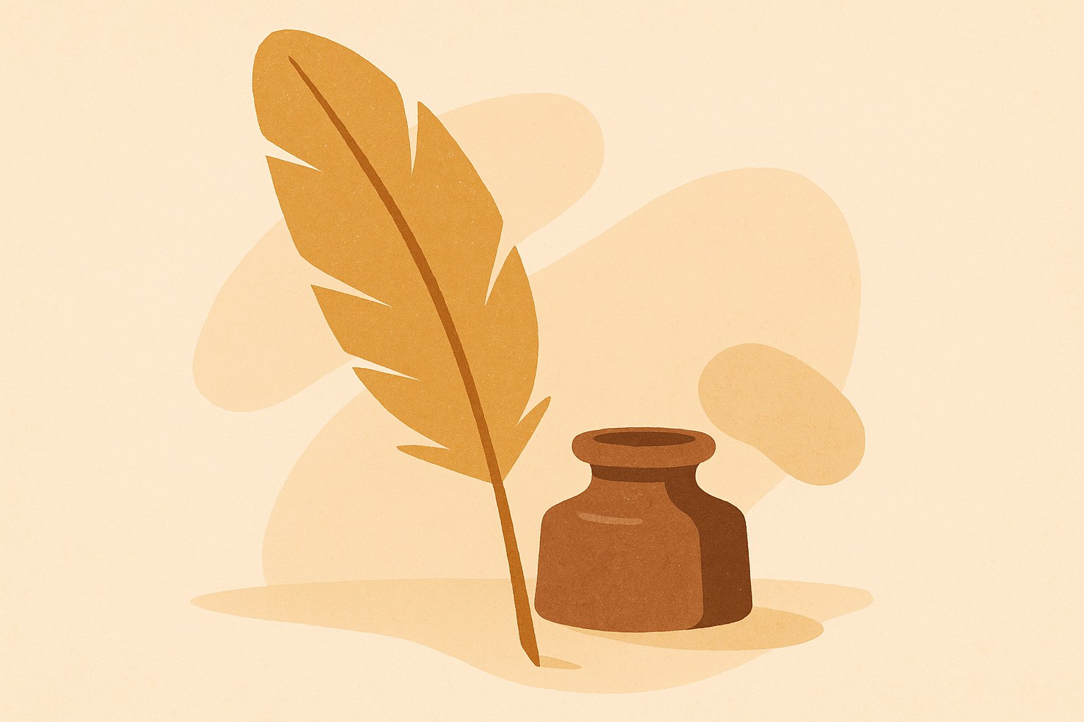 Illustration minimaliste en tons beige et brun, représentant une plume dans un encrier, une balance de la justice, un symbole paragraphe (§), un demi-cercle et des éléments décoratifs abstraits. Le fond crème uni et les formes douces donnent un style vintage et professionnel, parfait pour les cartes postales juridiques ou administratives.