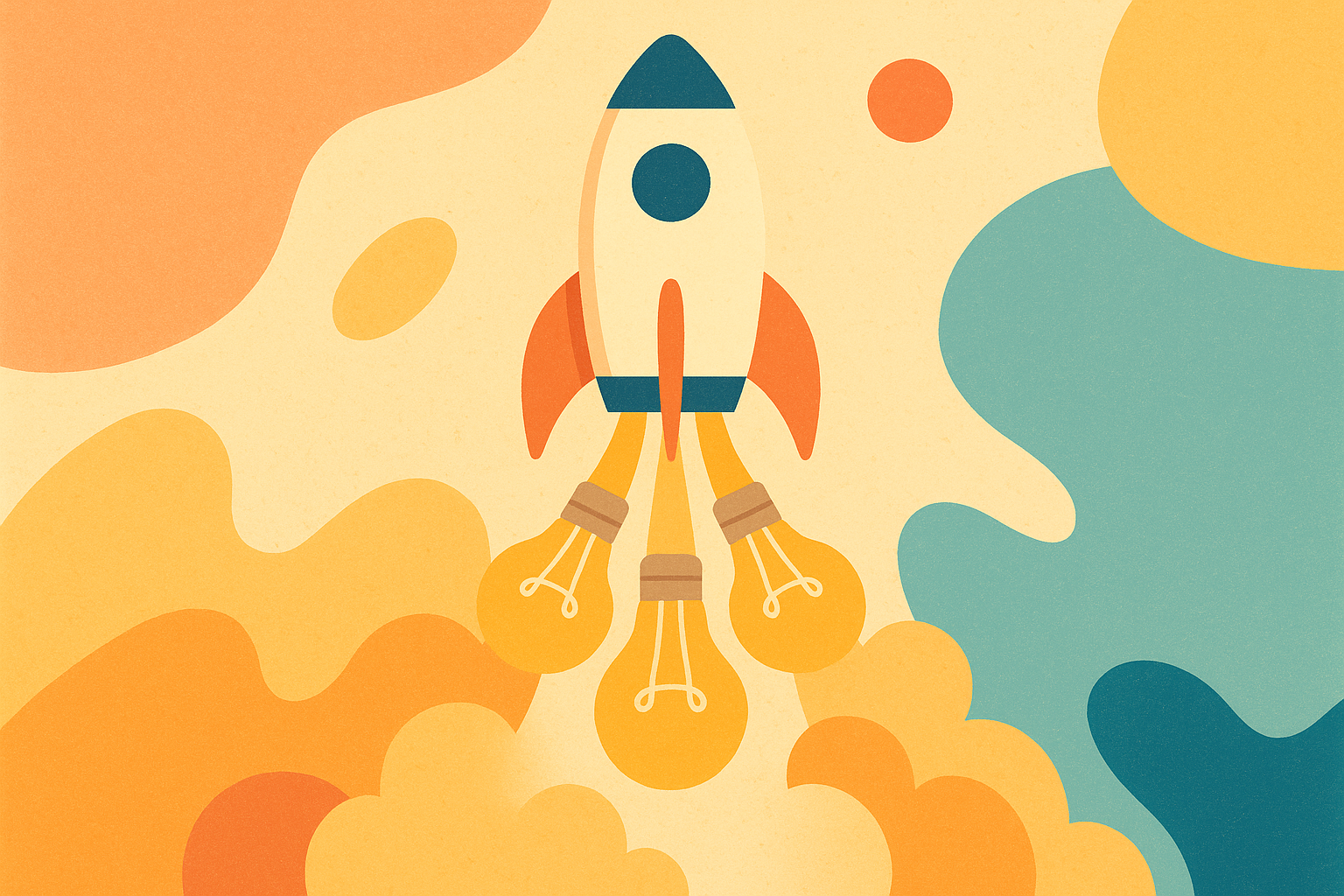 Illustration vectorielle au style plat avec une fusée rouge et bleue décolle au centre, propulsée par des ampoules jaunes en guise de moteurs, sur fond beige clair. Autour de la base, on trouve une tasse de café, un carnet orange, un stylo bleu, une ampoule, une feuille verte, un aimant rouge et jaune, des flèches bleues, un engrenage rose et des symboles mathématiques. Palette de couleurs chaudes et douces, ambiance créative et professionnelle.