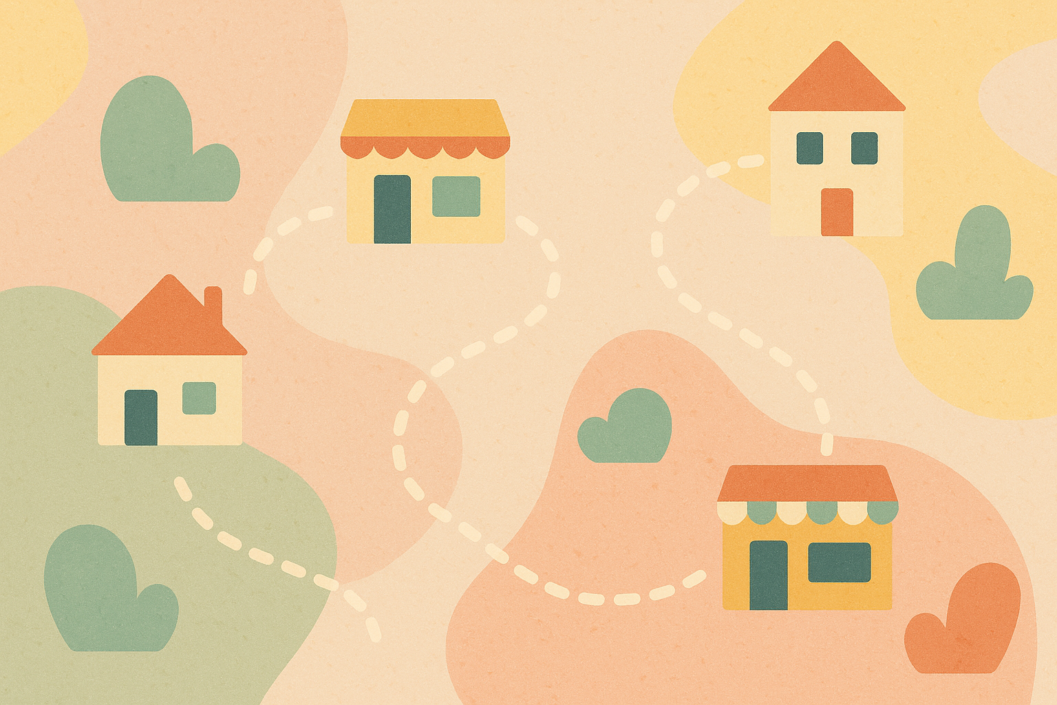 Illustration vectorielle minimaliste avec des maisons stylisées en tons pastel (orange, jaune, vert, rouge) sur fond crème. Une ligne pointillée serpente entre les bâtiments, représentant un chemin, avec un petit arbre vert au centre. Style plat, ambiance douce et accueillante, parfaite pour des visuels de communication professionnelle.