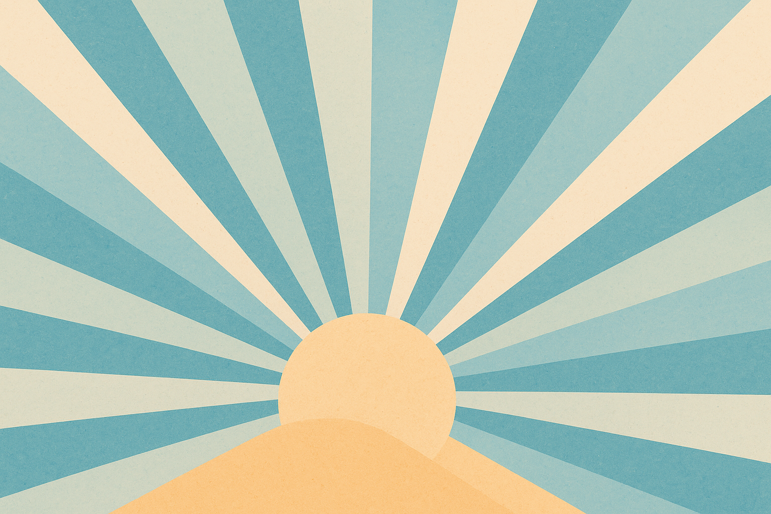 Illustration vectorielle minimaliste avec fond en rayons bleu clair et blanc évoquant un lever de soleil. Au premier plan, objets de bureau stylisés : plante verte en pot orange, lampe jaune, cadre avec paysage, tasse fumante bleu foncé, coussin rose pâle, livres empilés, formes géométriques. Palette douce et pastel, ambiance cosy et professionnelle.