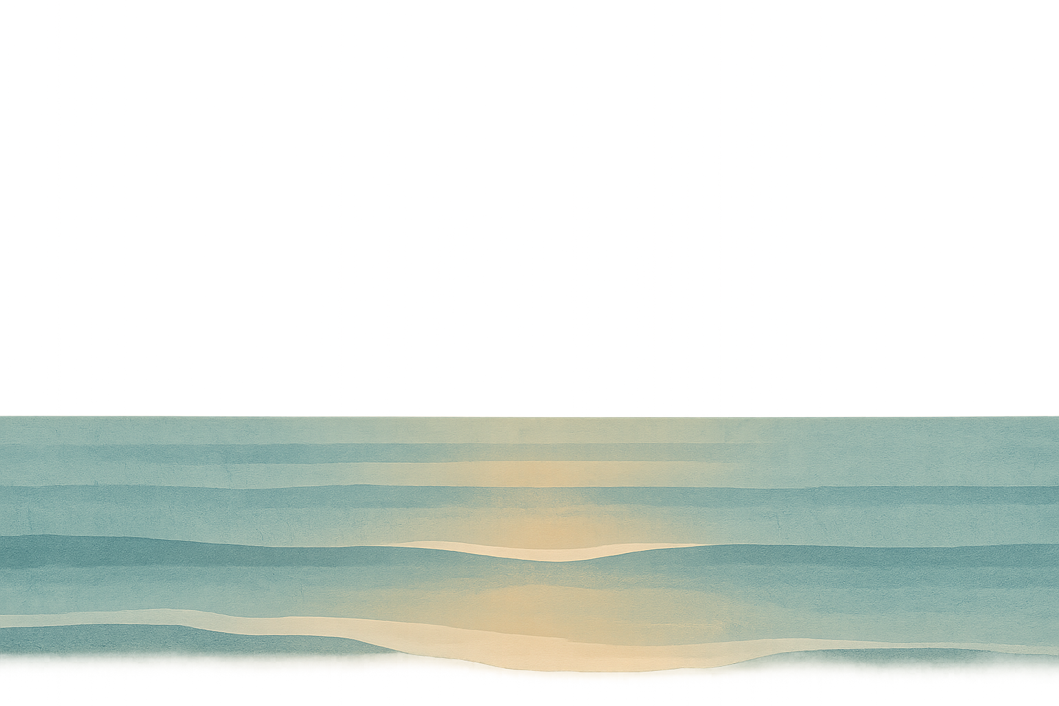 Illustration douce aux tons pastel avec un fond jaune dégradé, représentant une tasse de café, un livre ouvert, un vase orange avec feuillage vert-bleu, un paysage côtier stylisé avec soleil rond orange, mer bleu clair, colline verte et éléments végétaux. Ambiance calme et professionnelle, style minimaliste et chaleureux, parfait pour une carte postale de correspondance d'affaires.
